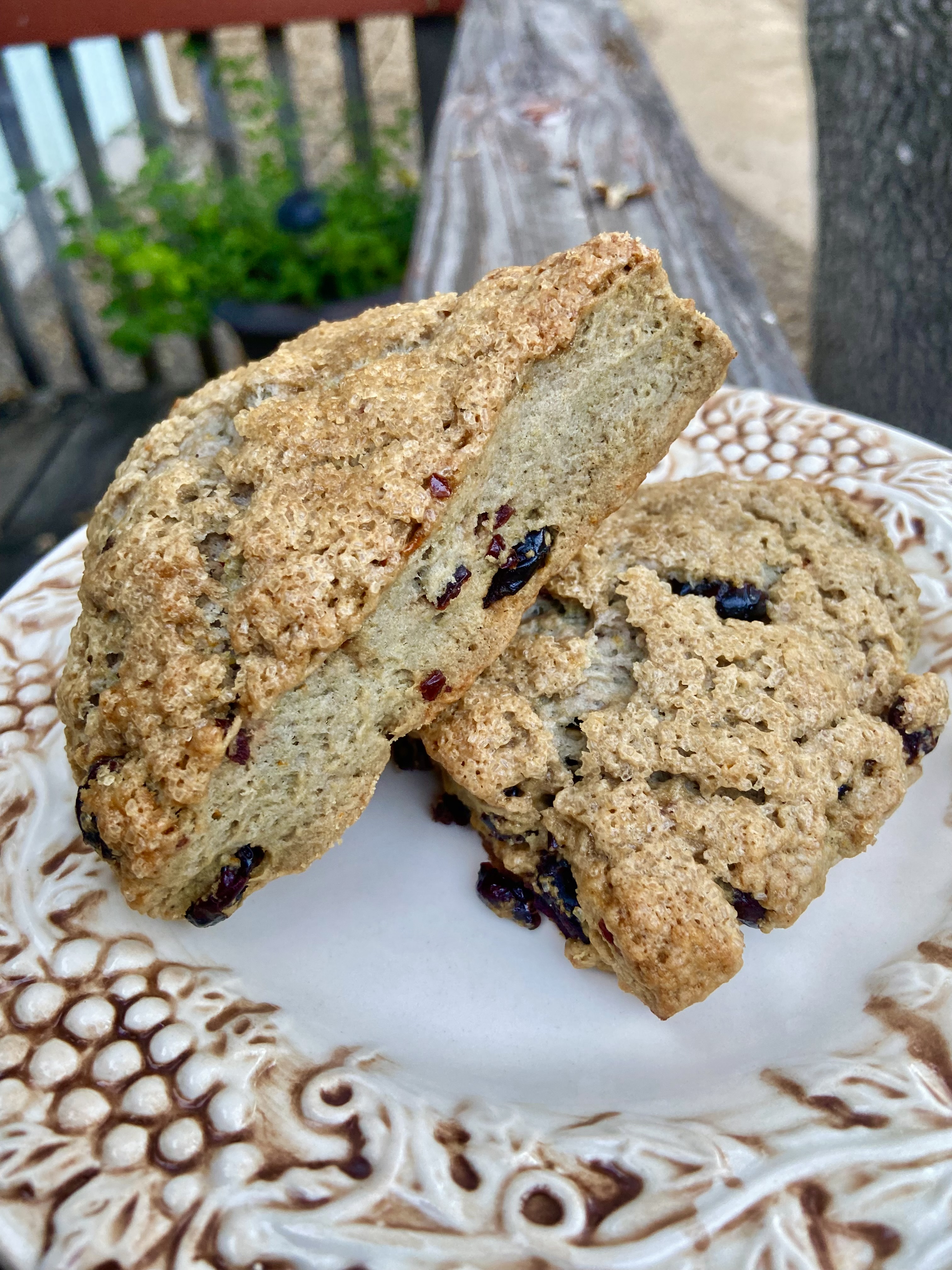 Ingredients: Flour, cream, butter, dried cranberries, orange herbal tea, orange zest, baking powder, salt, sugar