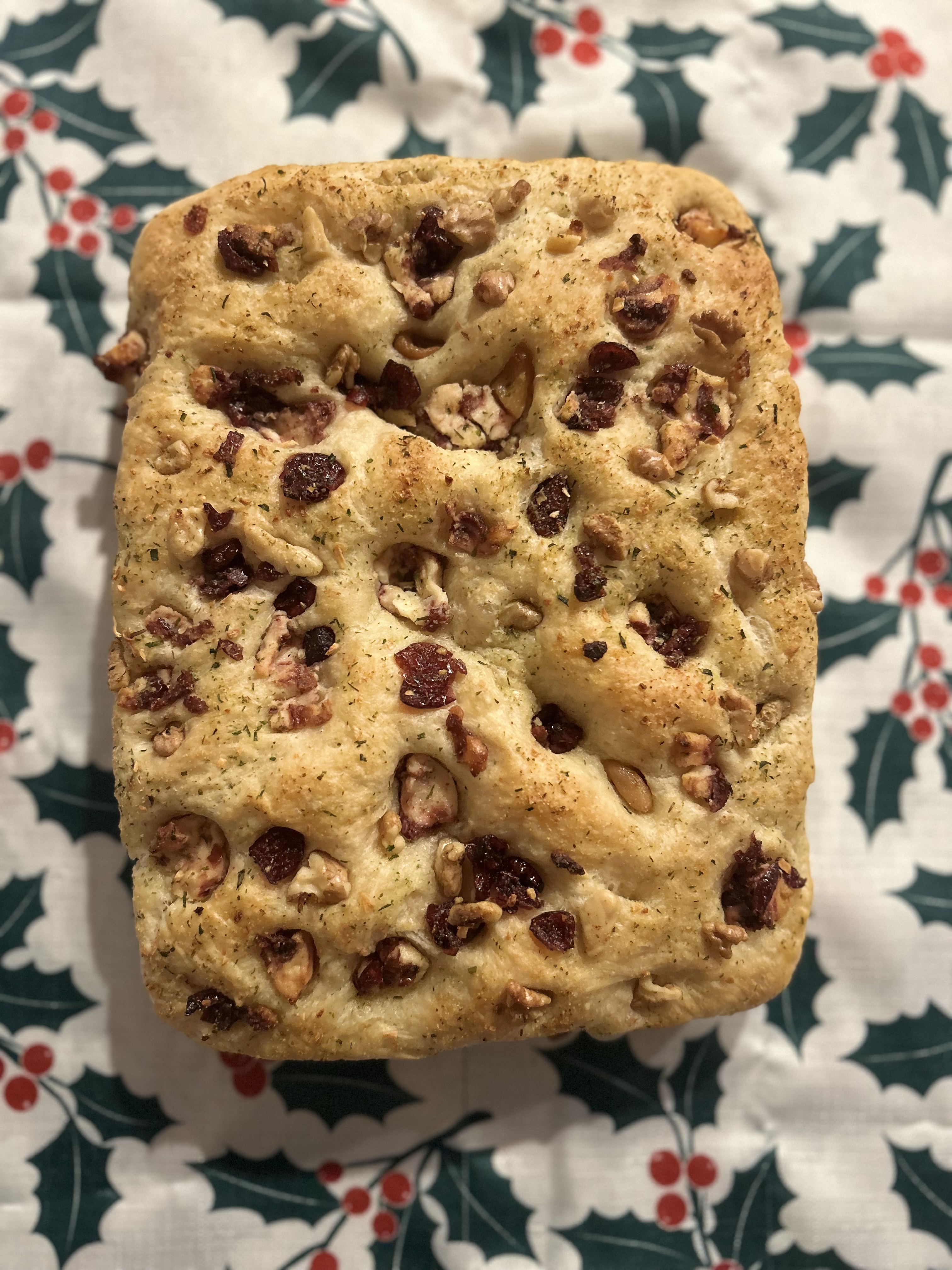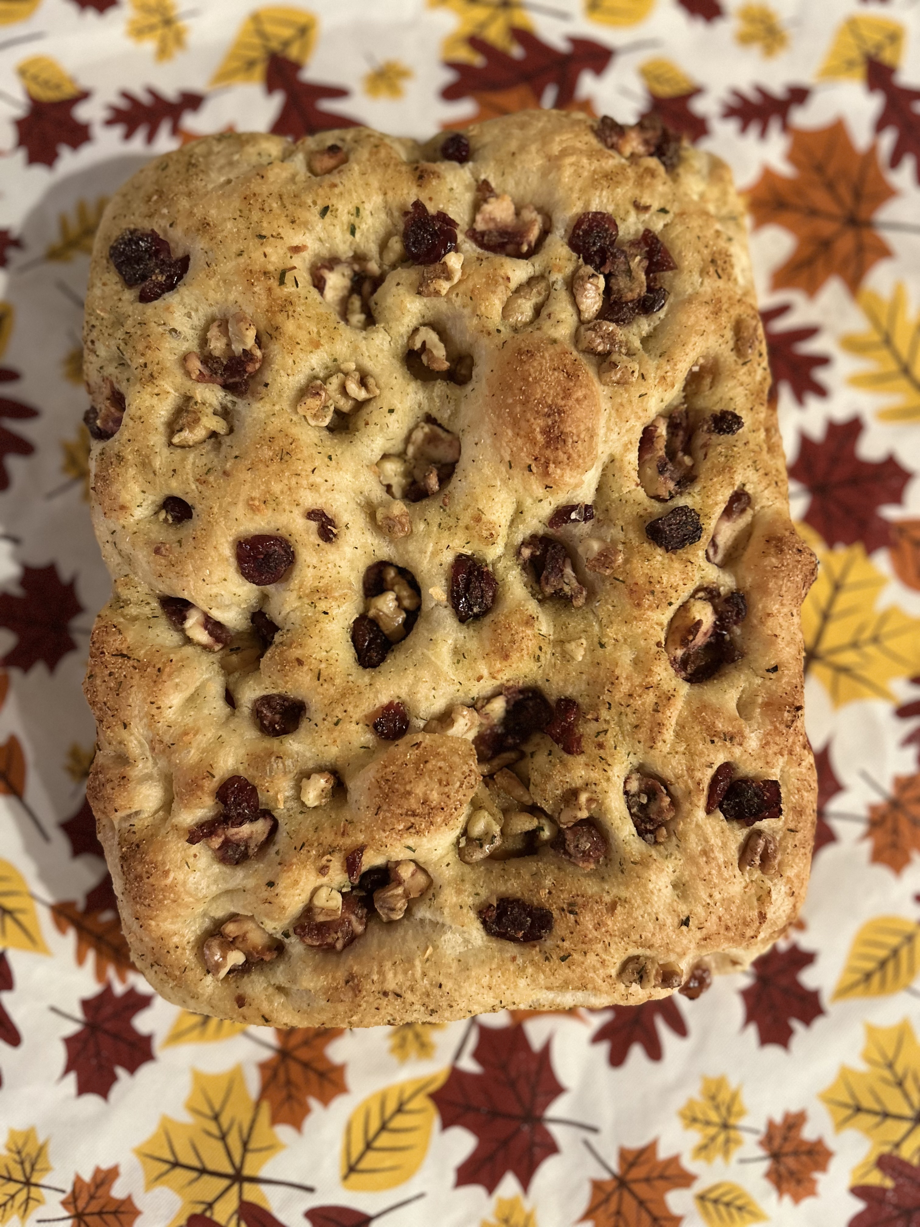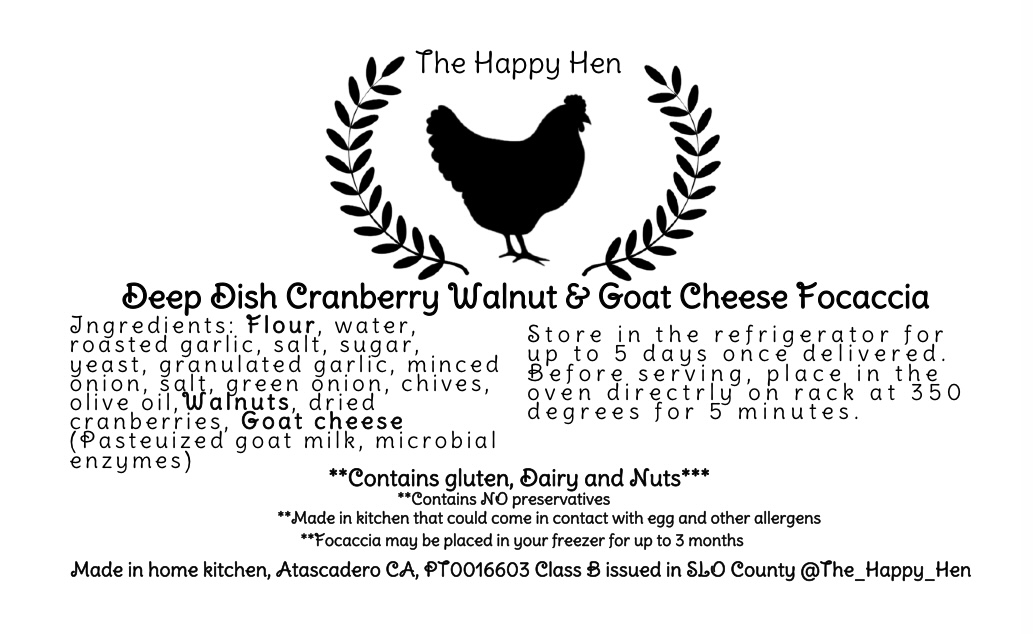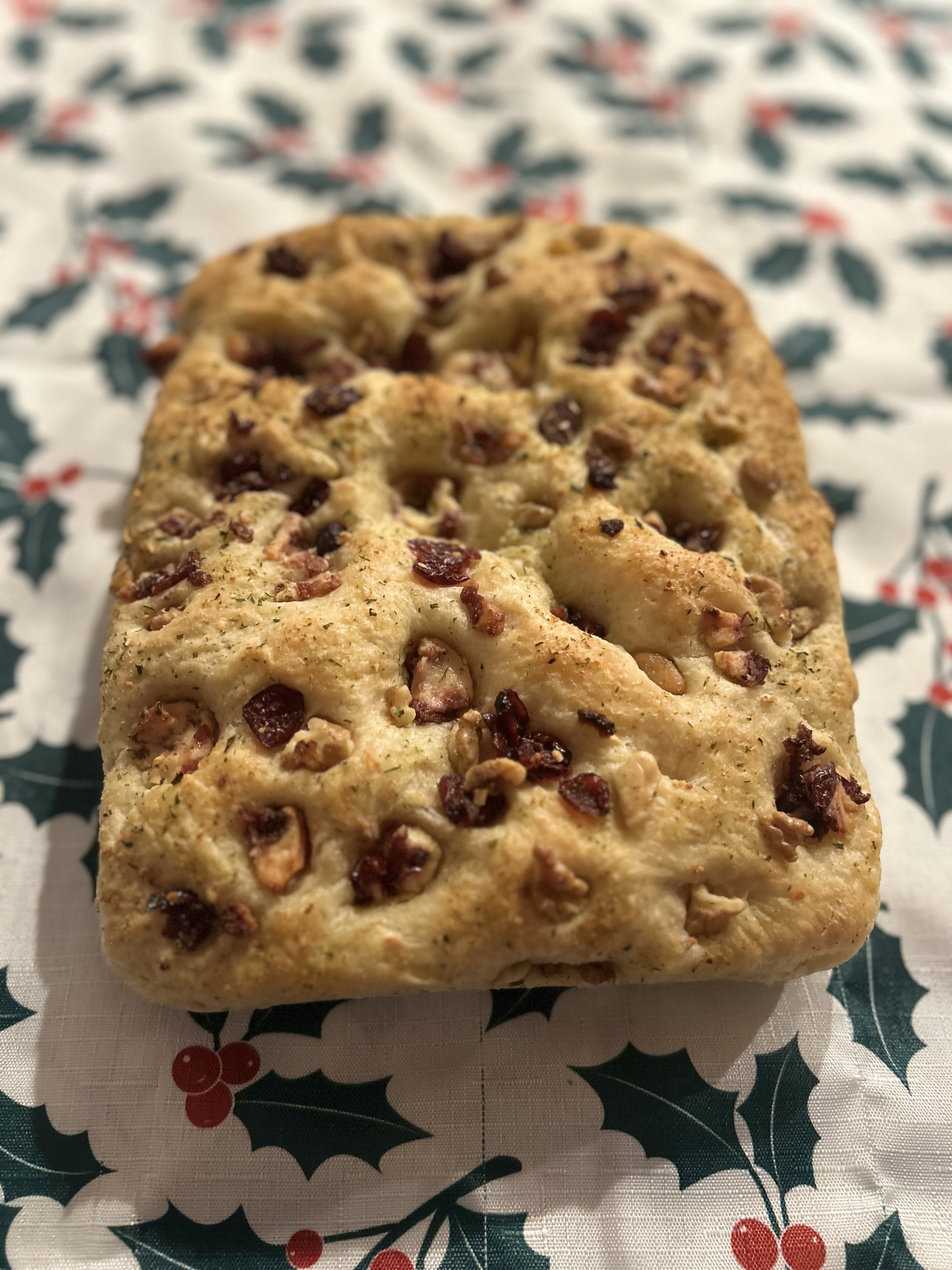 Indulge in our deep-dish cranberry walnut goat cheese focaccia, a sumptuous blend of flavors and textures. This artisan bread features a soft, pillowy base adorned with a rich layer of tangy goat cheese, tart and sweet cranberries, slow roasted garlic and crunchy, toasted walnuts. Drizzled with a hint of olive oil and sprinkled with herbs, each slice offers a delightful combination of savory and sweet, perfect for any occasion—whether served warm as an appetizer, enjoyed as a side dish, or savored on its own. Experience gourmet comfort in every bite!
