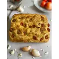 At the heart of this focaccia lies a generous layer of perfectly caramelized onions, slowly cooked to enhance their natural sweetness and complement the robust, roasted garlic.