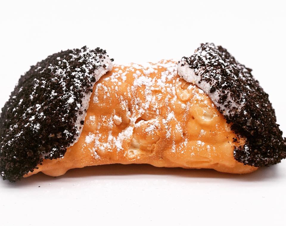 Once shell is filled with the filling, we dunk each end into either chocolate chips, Oreo crumbles, or pistachio.  Each cannolo is made to order.