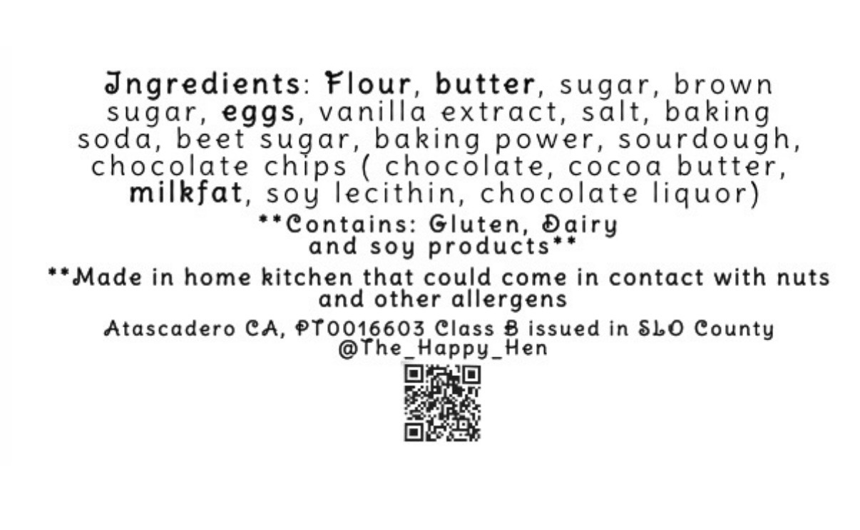 Ingredients: Flour, butter, sugar, brown sugar, eggs, vanila extract, salt, baking soda, beet sugar, baking power, sourdough, chocolate chips (chocolate, cocoa powder, chocolate liquor, milk fat, soy lecithin)