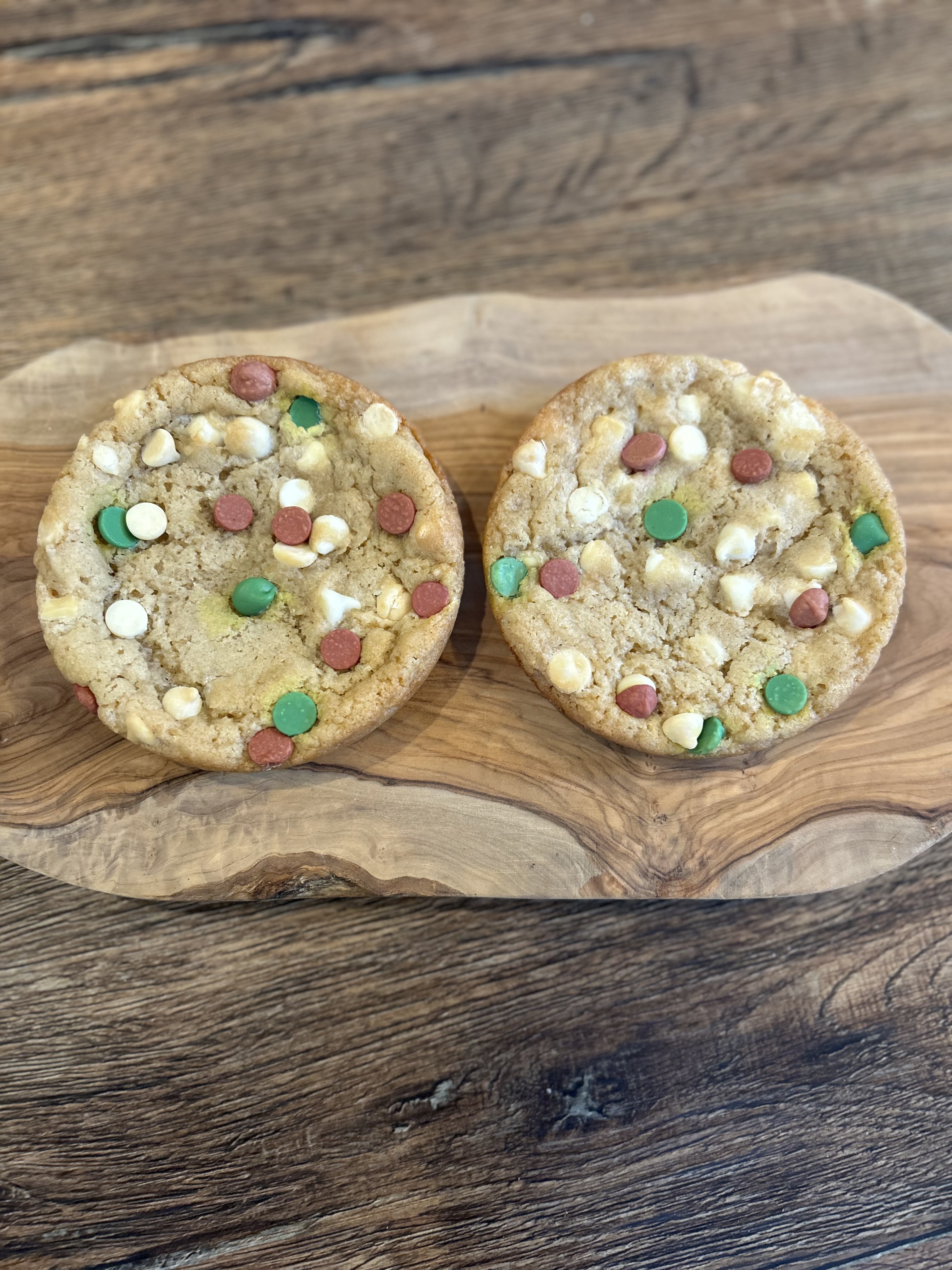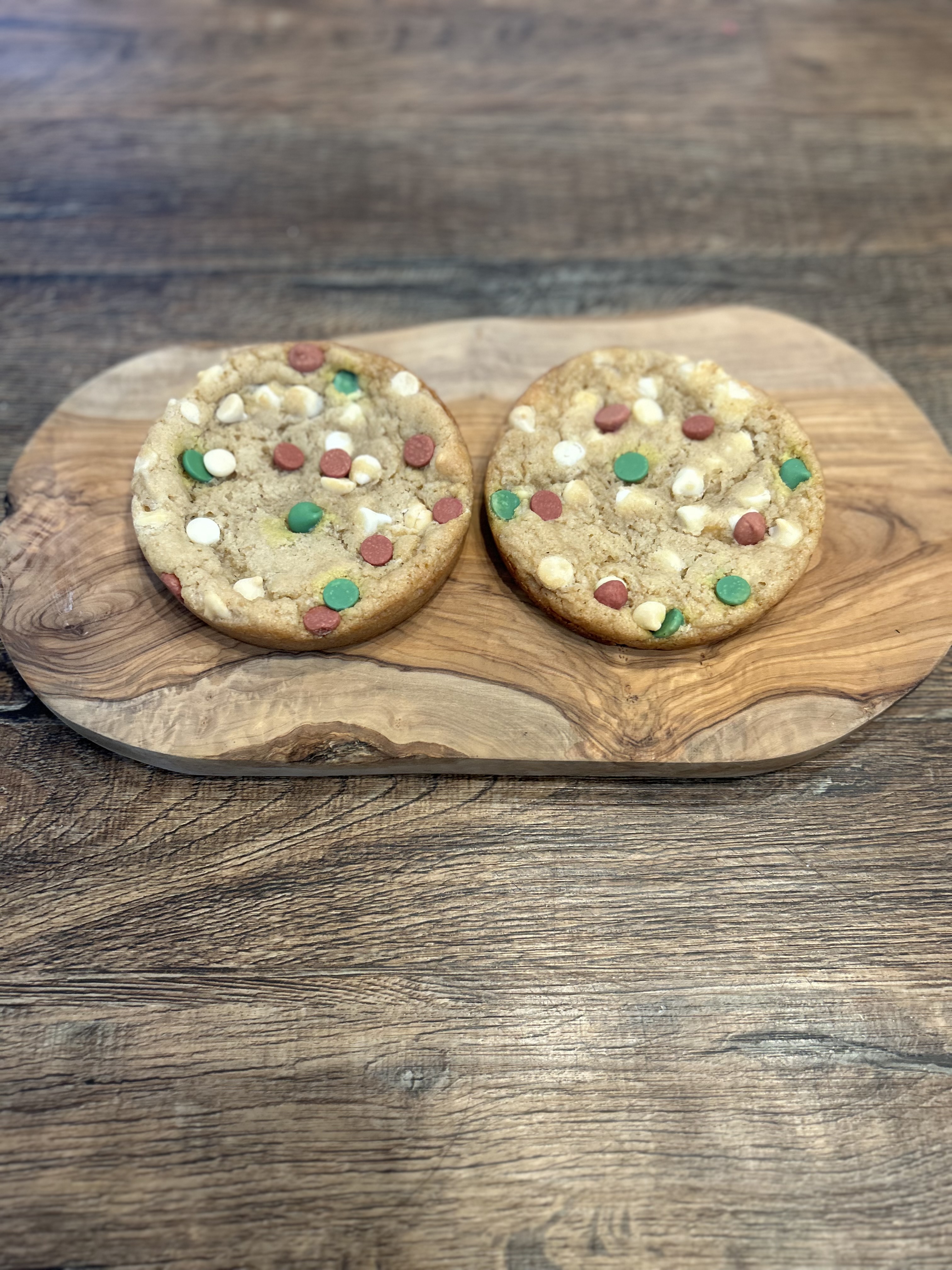 Each cookie is crafted with tangy sourdough flavor profile, complemented by creamy white, green and red chocolate chips and topped with course sugar.