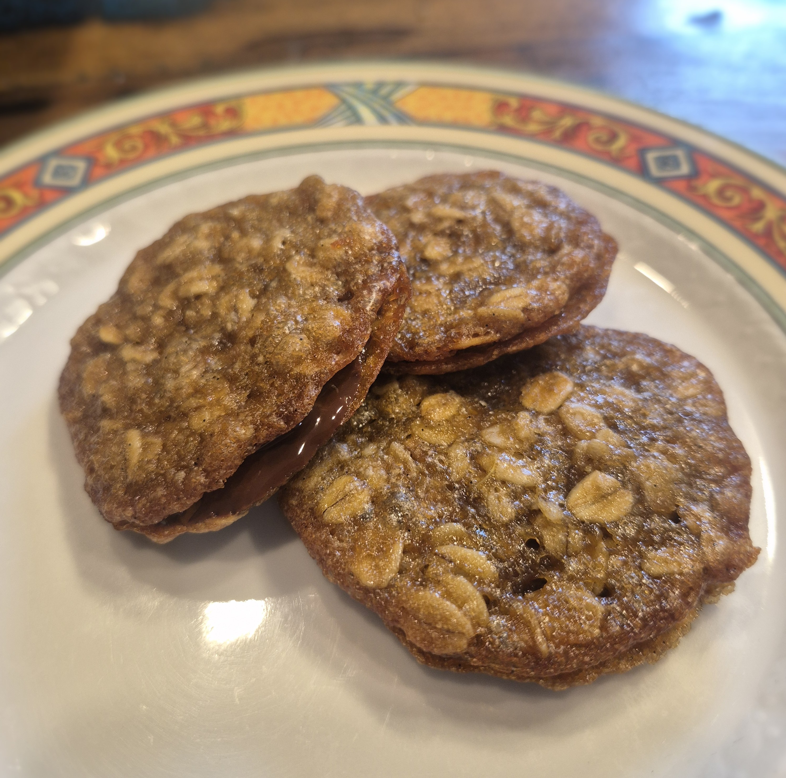 Comes with 20 sandwich cookies.Grandma Burn's famous oatmeal lace cookies. Oatmeal cookies with the perfect chew, sandwiched with a dark chocolate center. Comes with 20 cookie sandwiches.