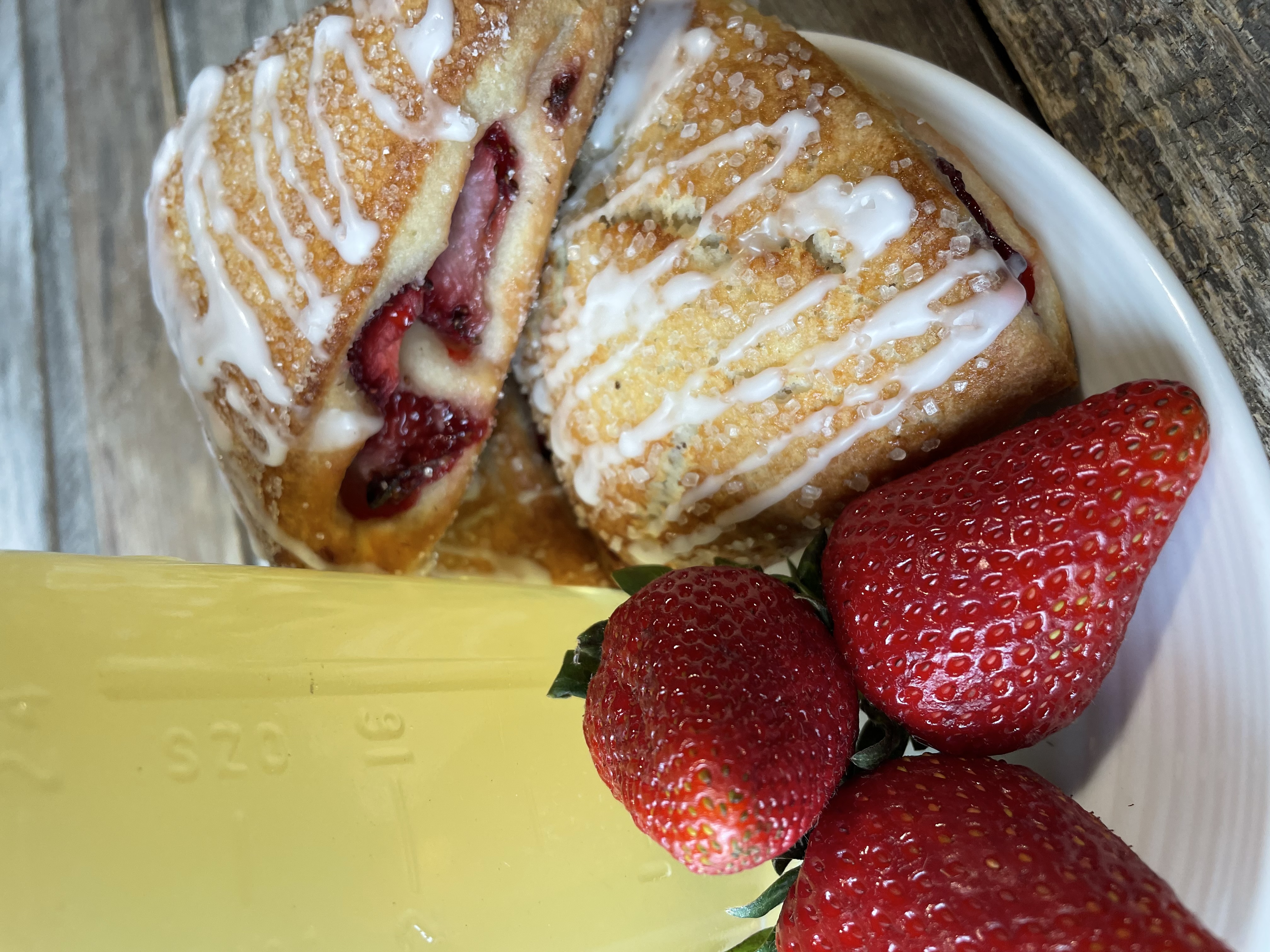 Cream scones filled with local strawberries and lemon zest. Excellent for summertime. Topped with crystallized sugar.