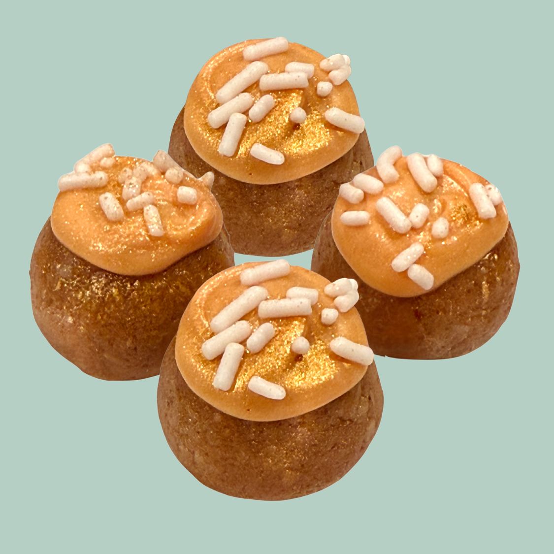 INGREDIENTS: Natural Peanut Butter, Raw Honey, Plant-Based Vanilla Protein Powder, Gluten Free Whole Grain Quick Oats, White Chocolate, Flaxseed Meal, Mini Marshmallows, Sugar-Free Orange Jello Mix, Orange Vanilla Extract, Plant-Based Natural Food Color, White Sprinkles, Edible Gold Glitter