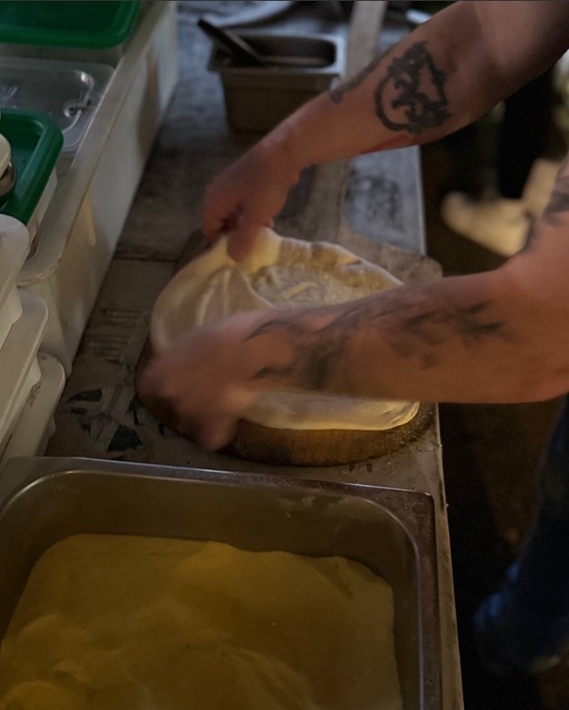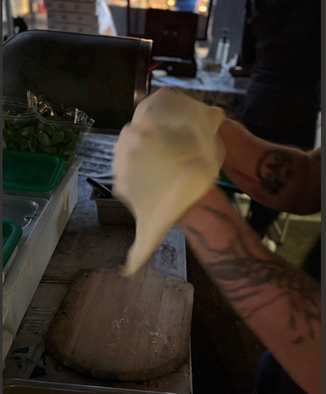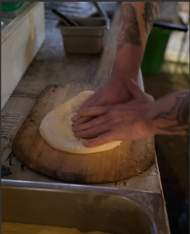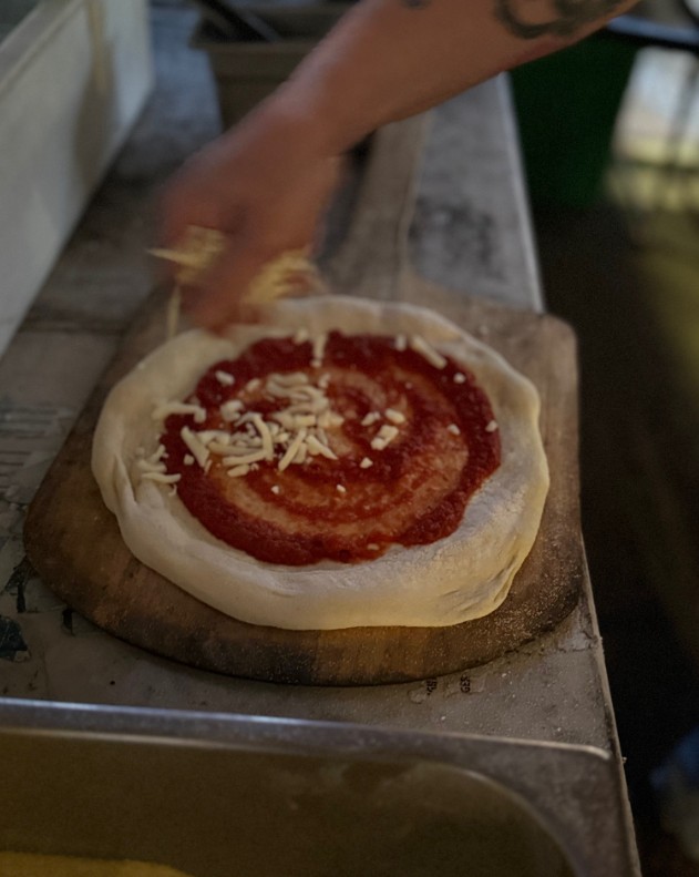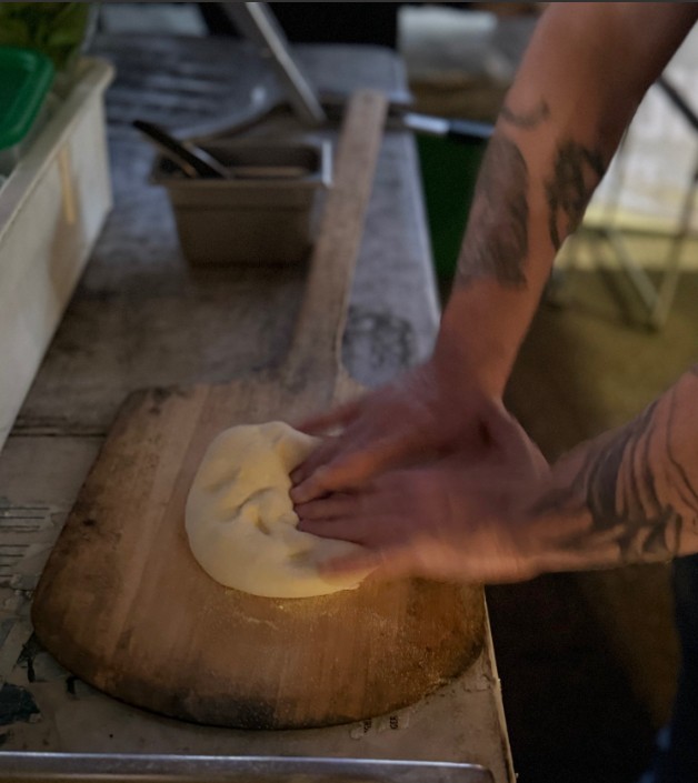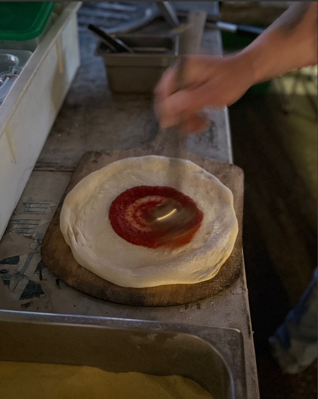 Our dough is made with Caputo double zero flour, including 50% biga. Biga is made with flour, water, and fresh yeast, then stays at the room temperature for 1 hour, and in the refrigerator for another 24 hours. Afterwards, we mix more fresh flour, yeast, water, salt, and EVOO (extra virgin olive oil). We let our bulk dough ferment at a room temperature for approximately 4-6 hours and place it in the refrigerator for another 18-20 hours.