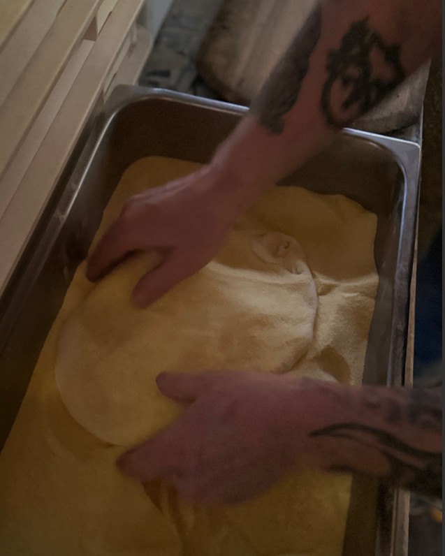 During the day of baking, we take the dough out of the refrigerator 4-6 hours ahead. It is important to ensure that the dough reaches internal temperature of and is soft to be stretched.