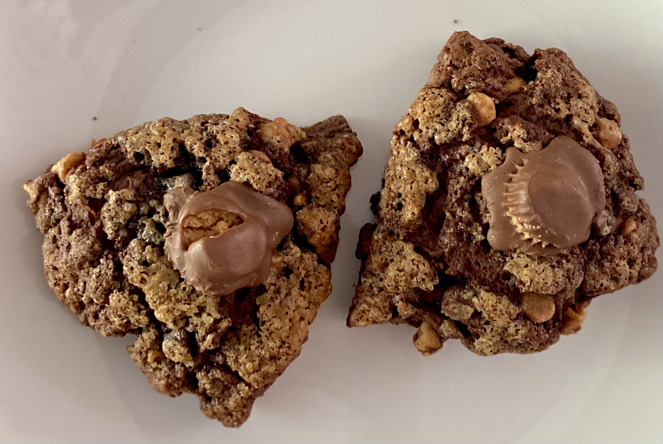 Peanut Butter & Chocolate Scones are made with butter, cream, cocoa, peanut butter chips, and milk chocolate chips. These just baked scones come in a box of two. Ready to eat upon delivery.