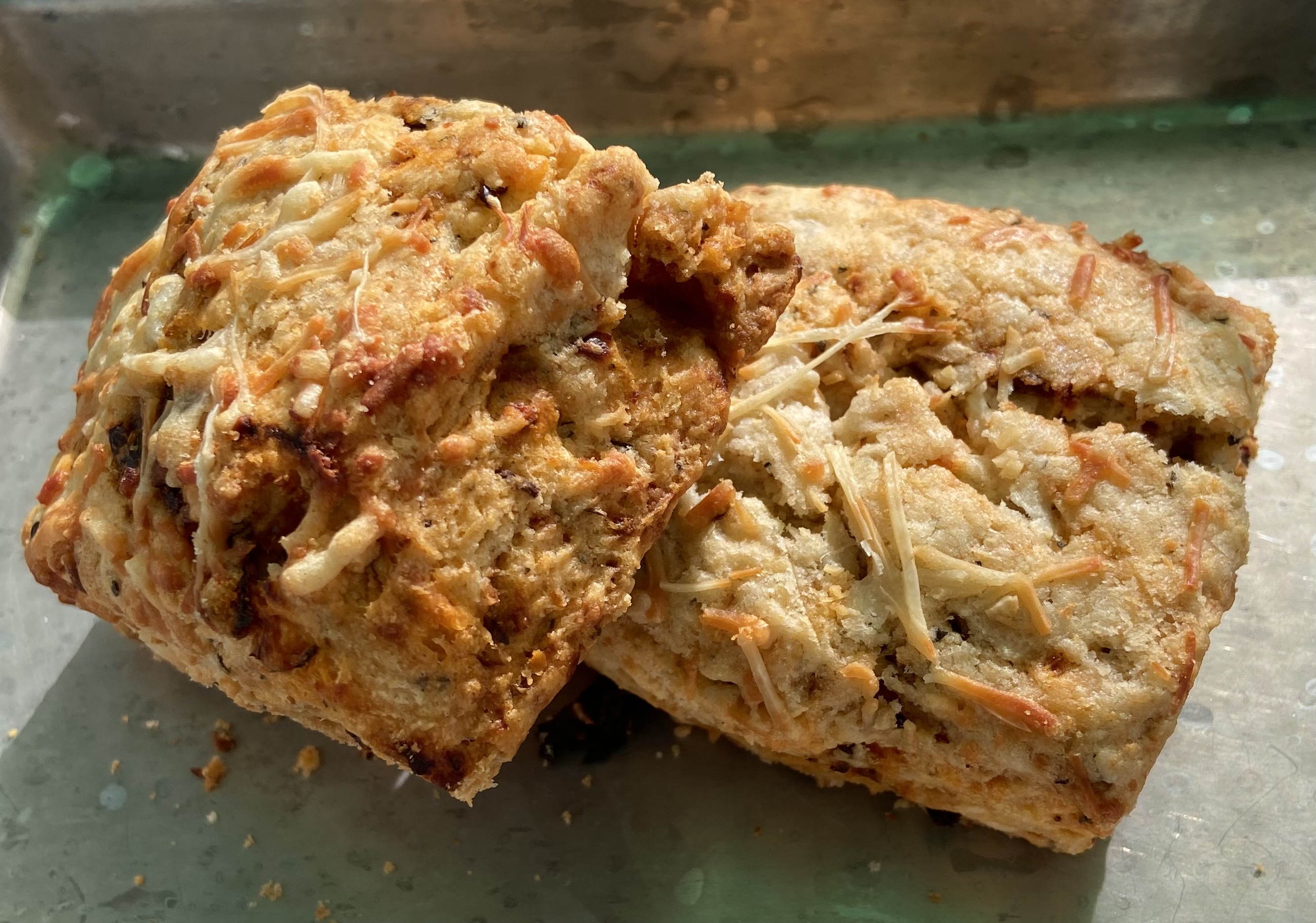 Ingredients: Flour, cream, butter, sundried tomatoes, Manchego cheese, basil, Soffrito Seasoning,baking powder, salt, sugar