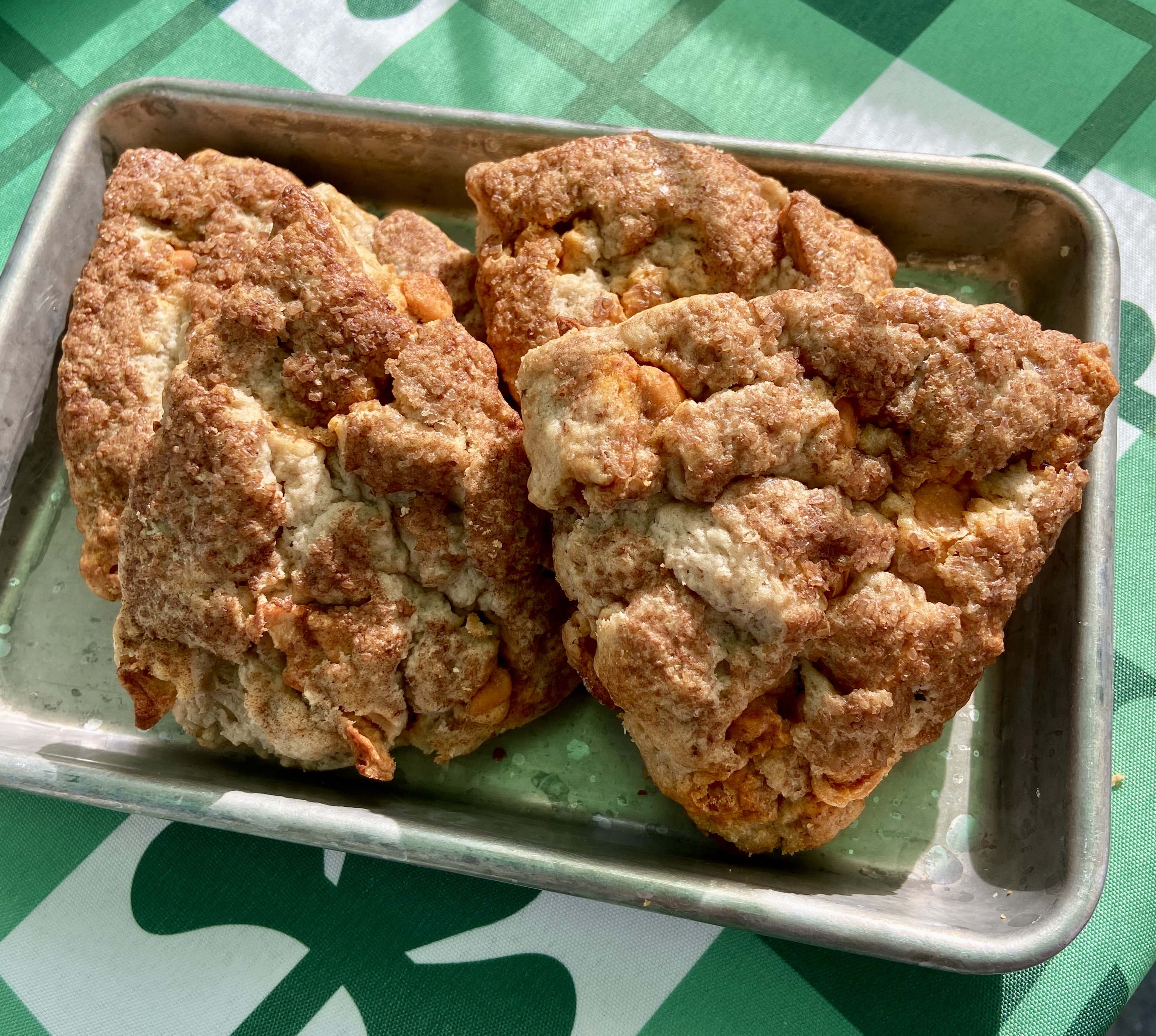Ingredients: Flour, cream, butter, dried apples, cinnamon, caramel chips, baking powder, salt, sugar