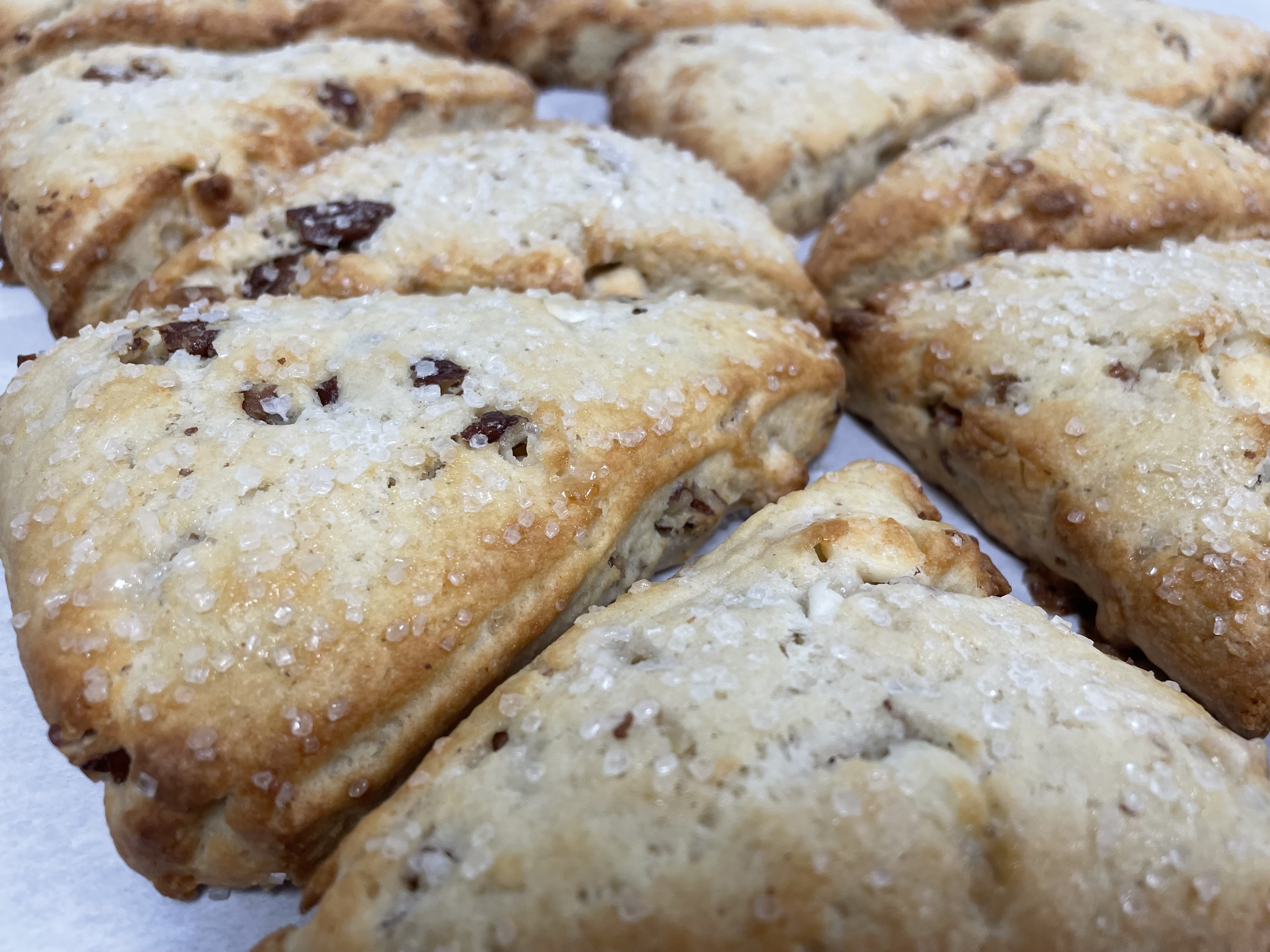 Delicious white chocolate pecan scones with crystalized sugar on top! One of my favorite scone flavors!