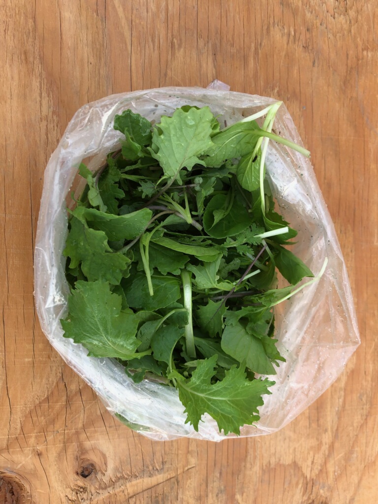 This blend of mildly flavored baby lettuces include red and green butter, tatsoi, spinach, and kale. Priced at $4 bag (1/4lb)