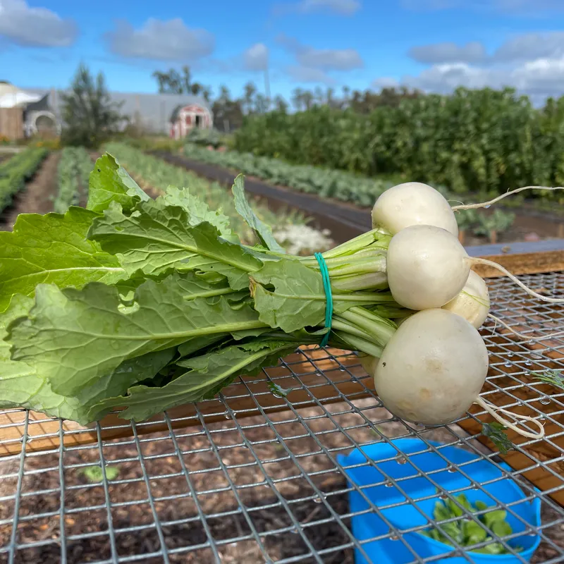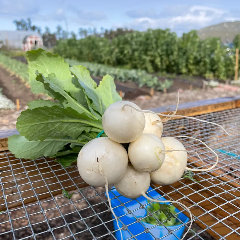 A staff favorite.... but we are willing to share a few ;) These delicate, Japanese turnips are delicious and super versatile. Eat them raw, pickled, sautéed, roasted, or broiled WITH their greens. Great savory or sweet. Sold as a bundle of 6-7 turnips. We love this recipe: https://nesfp.org/world-peas-food-hub/world-peas-csa/produce-recipes/miso-glazed-hakurei-turnips All City Farm SLO produce is grown with only organic inputs using regenerative agricultural practices. All sales directly support our youth education programs. Learn more at cityfarmslo.org.