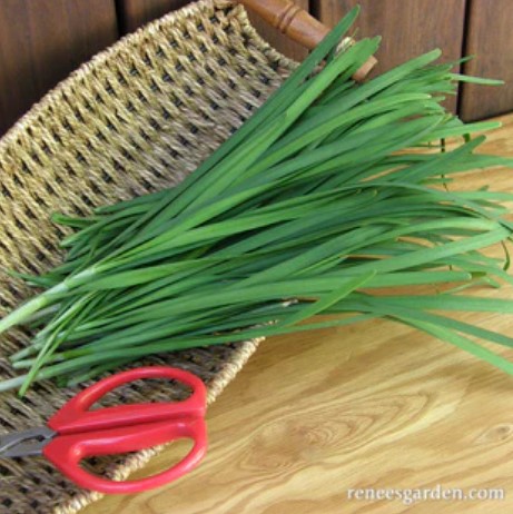 "Garlic chives, also called Chinese chives, have slim flat grass-like leaves that taste like a perfect combination of sweet garlic and chives. Just snip them over salads, fresh vegetables, or any savory dish to add a subtle and delicious garlic accent without any of the fuss." - Renee's Garden Online Seed Description