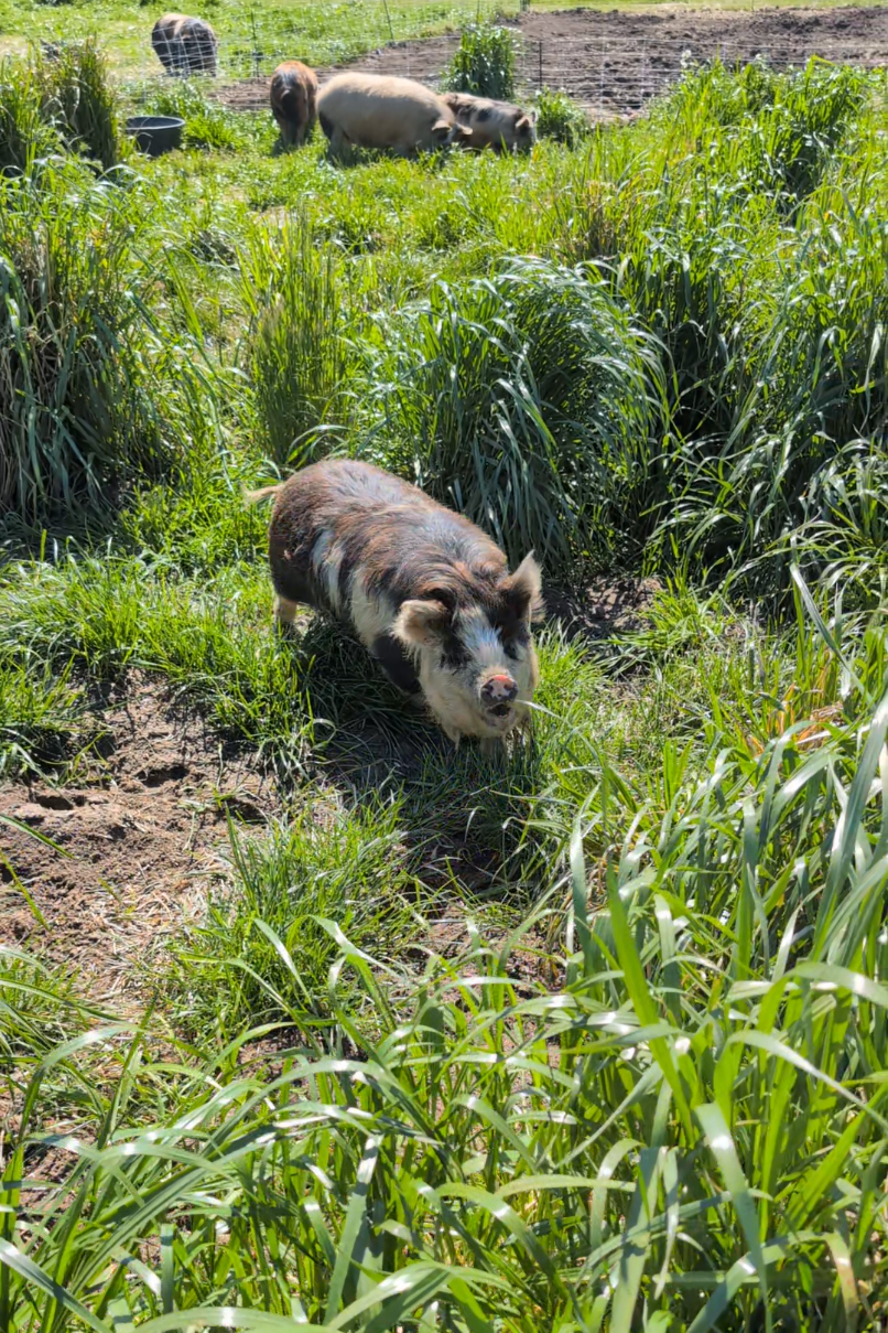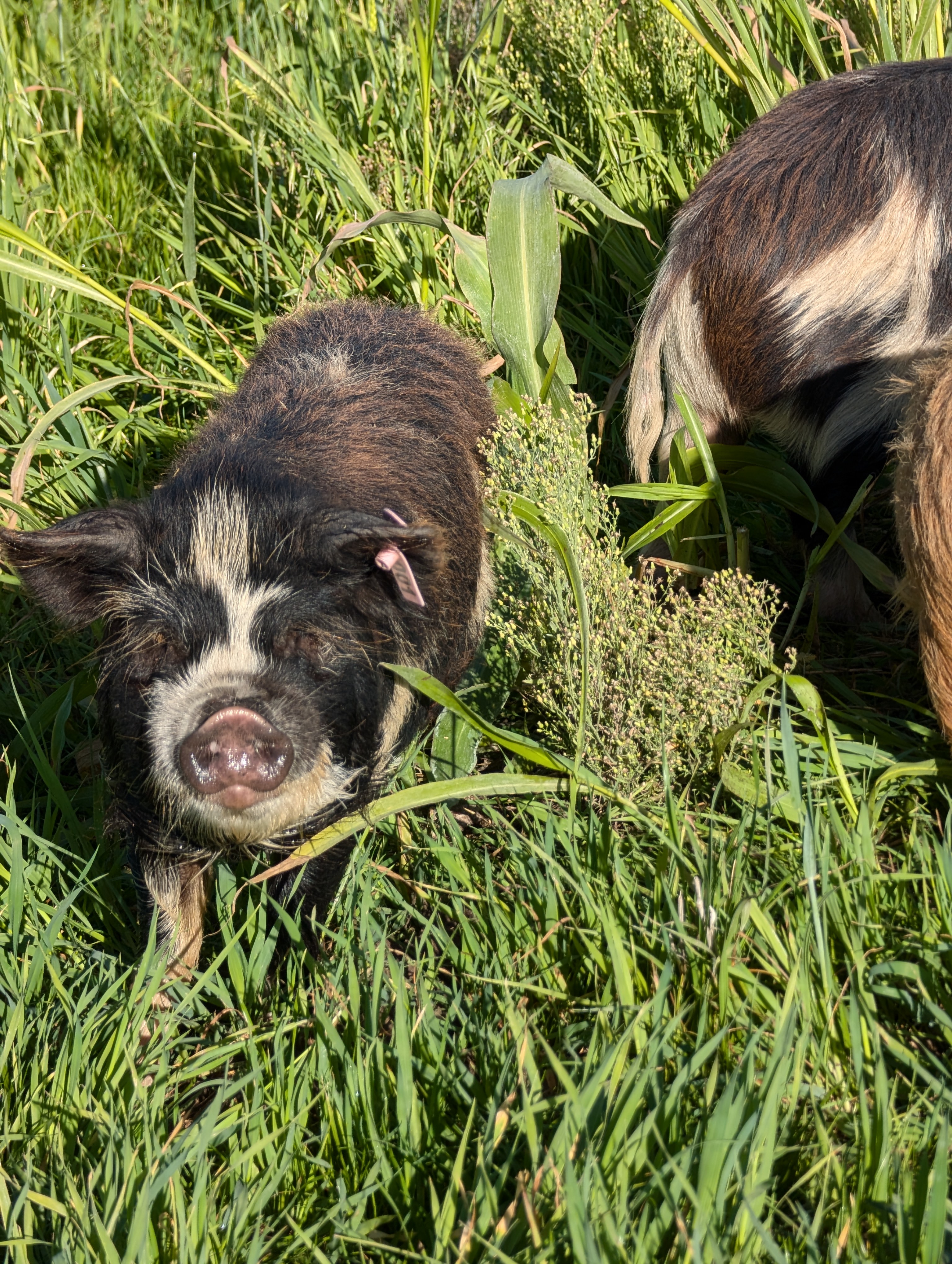 Our KuneKune pigs are raised entirely on open pastures, where they forage freely and live as pigs should — without confinement, antibiotics, or hormones. As part of a regenerative farm system, they actively rebuild soil health, enhance biodiversity, and help restore balance to the land.