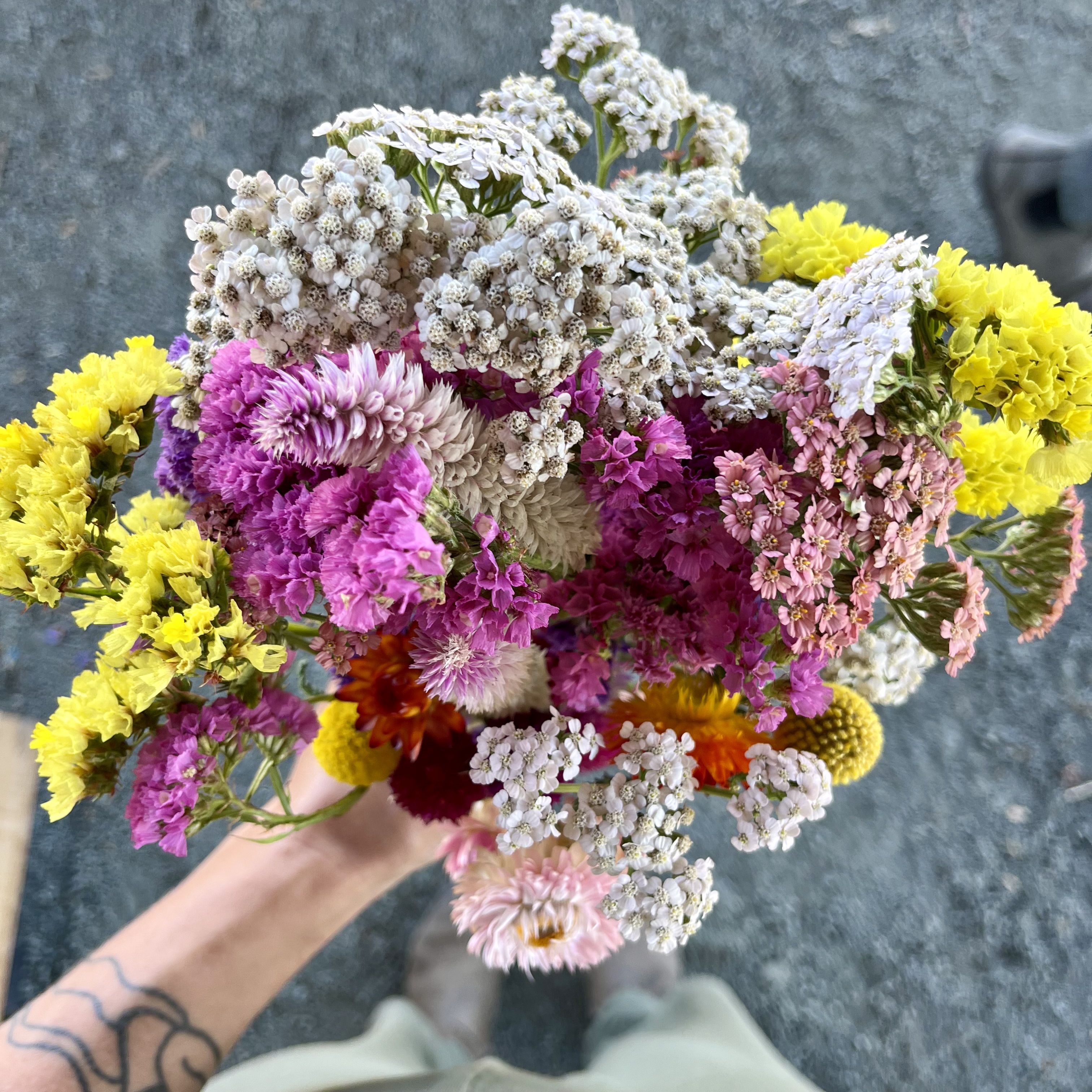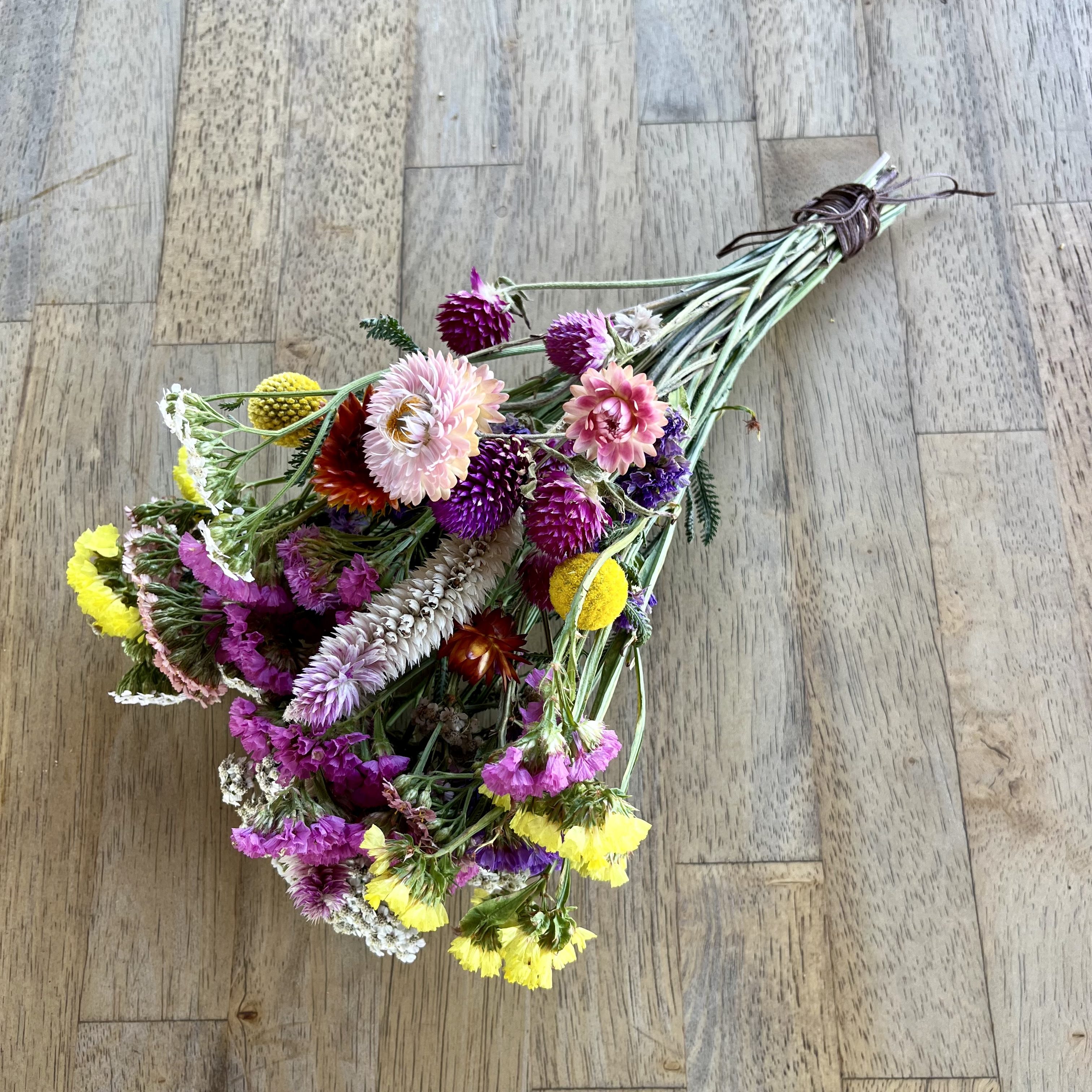 18-22 stems of our dried flower varieties, including statice, strawflower, yarrow, gomphrena, celosia, & more. These blooms are grown to last forever! Keep out of sun & in aerated spaces for continued drying & longevity.