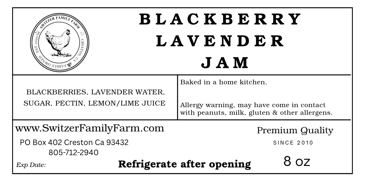 This jam is so good! Its made with fresh sweet blackberries and farm fresh lavender. You might be asking, how 'lavendery' does it taste? I know lavender is strong! Well you will be happy to know that our jam is very very blackberry with just a kiss of lavender. You know its there but barley. Its just enough to make this jam amazing!! One of our best sellers. 8 oz