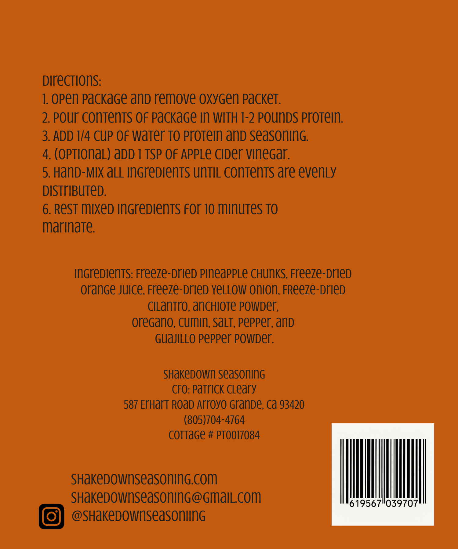 Ingredients: Freeze dried pineapple chunks, freeze dried onions, freeze dried orange juice, freeze dried cilantro, freeze dried orange zest, annatto powder oregano, cumin, salt, pepper, and guajillo pepper power.