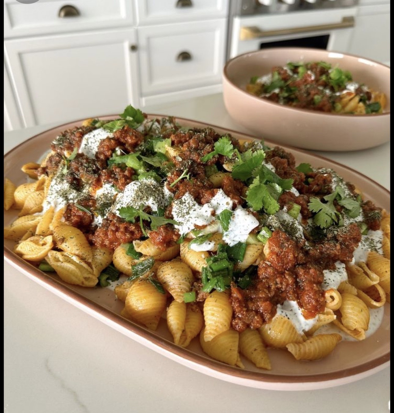 Afghan pasta typically consists of ground beef cooked with fresh, organic ingredients like tomatoes, onions, garlic, and spices, served over pasta. It's a flavorful and hearty dish that combines elements of Afghan and Italian cuisines.