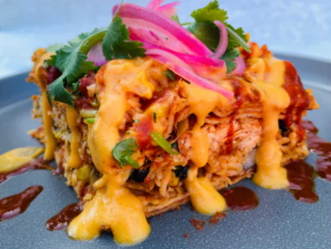 Slow cooked chicken in fragrant mexican chilies, cilantro lime rice, organic sweet corn, fire roasted peppers and black beans layered with corn tortillas house enchilada and "nacho" sauce.
