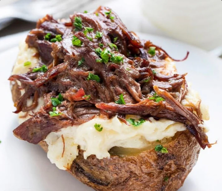 Seasoned grass-fed beef sirloin, seared golden and braised for 3 hours low and slow. Served on a voluptuous ruesset potato that's been baked, scooped and mixed with roasted garlic, mirepoix and lactose-free cheesy goodness. Topped with a flavor bomb of herbed pan jus and chives.