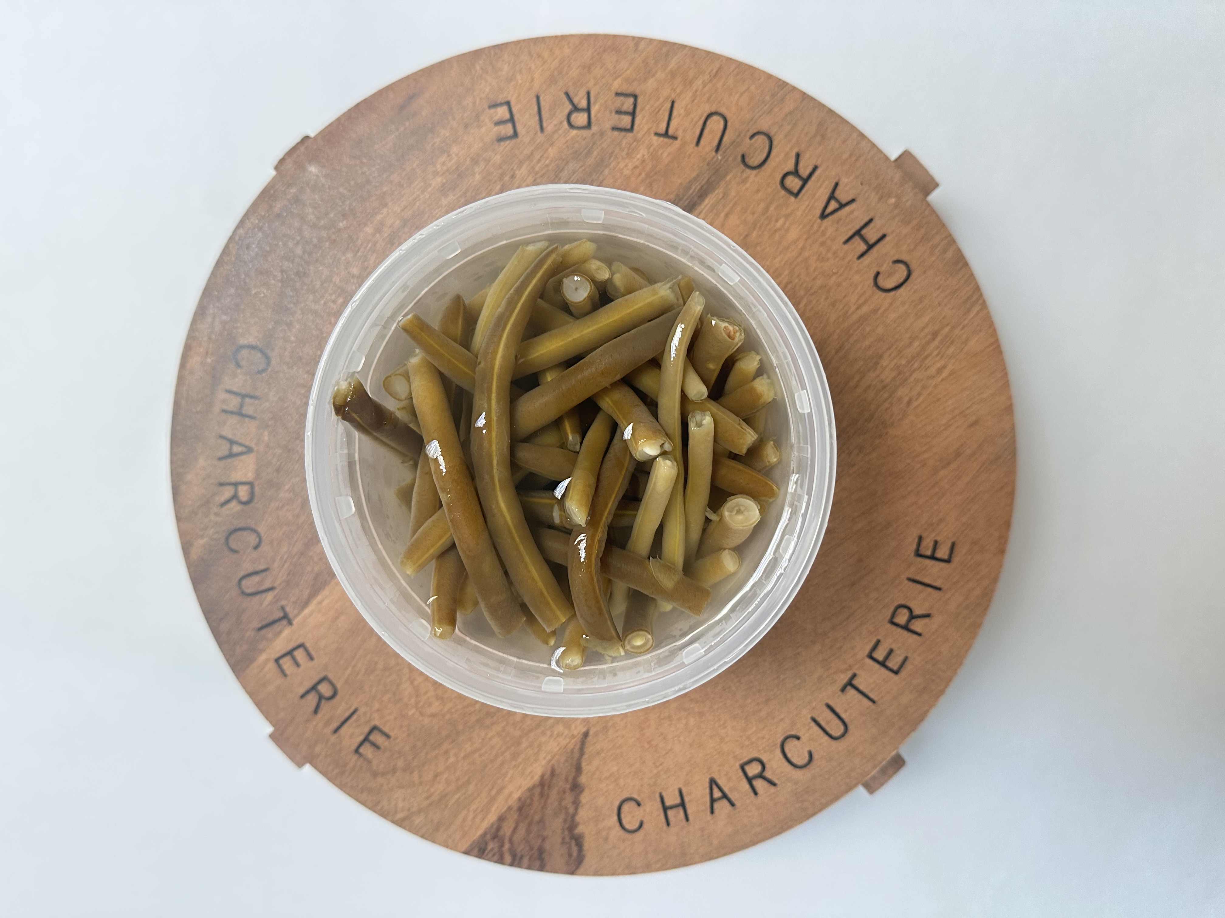 Snappy green beans pickled with garlic and a touch of crushed red pepper for a subtle heat. Balanced with tangy vinegar and warm spices for a bold, crunchy bite.