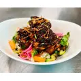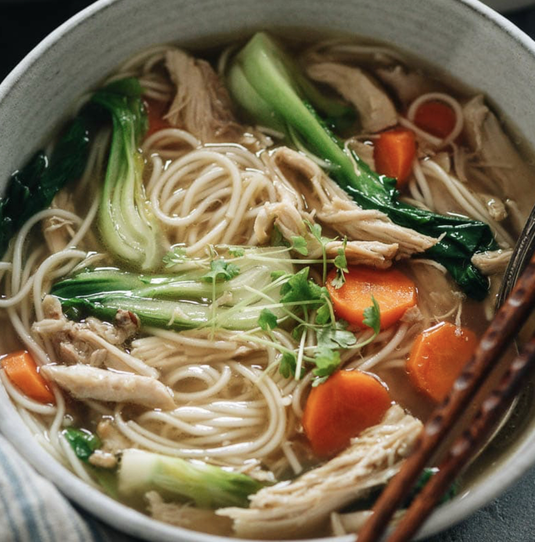 Fresh chicken seasoned and slow roasted until golden. Gluten-free noodles, carrot, green onion, baby bok choy, ginger, toasted sesame, in a savory sweet chicken broth.
