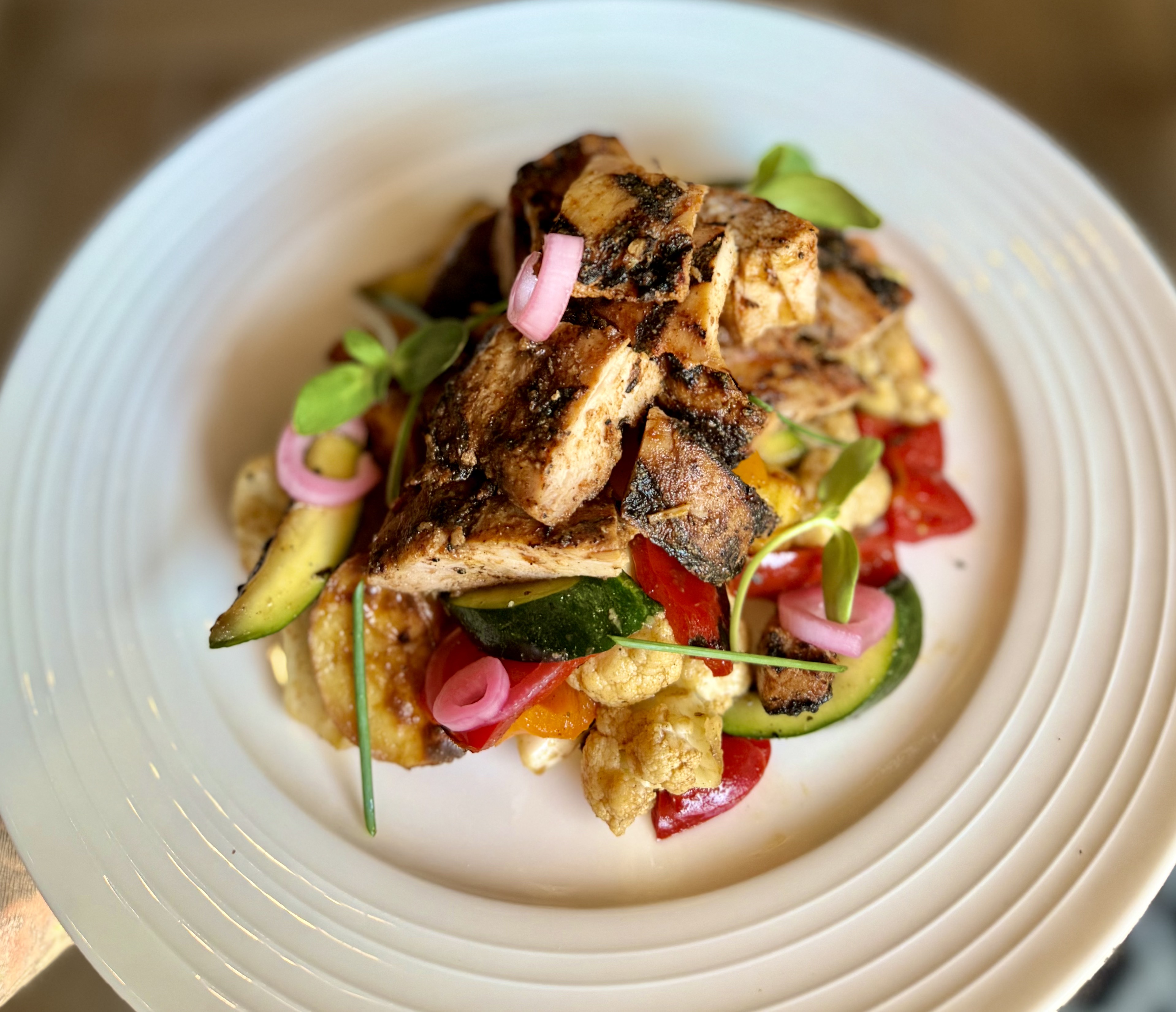 Organic chicken char grilled and glazed in CMK honey bbq sauce, grilled zucchini, bell pepper, mushroom, onion, cauliflower, yellow summer squash, and baby potatoes. (low carb)