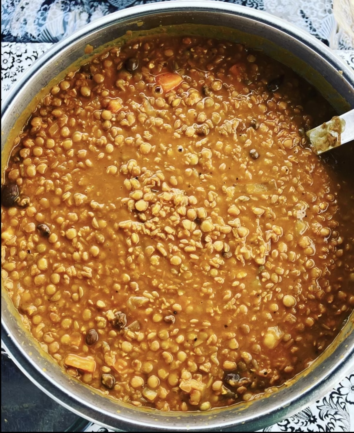 Ingredients: green lentils, coconut milk, carrot, onion, raisins, ginger, coconut oil, tomato, pink salt, spices
