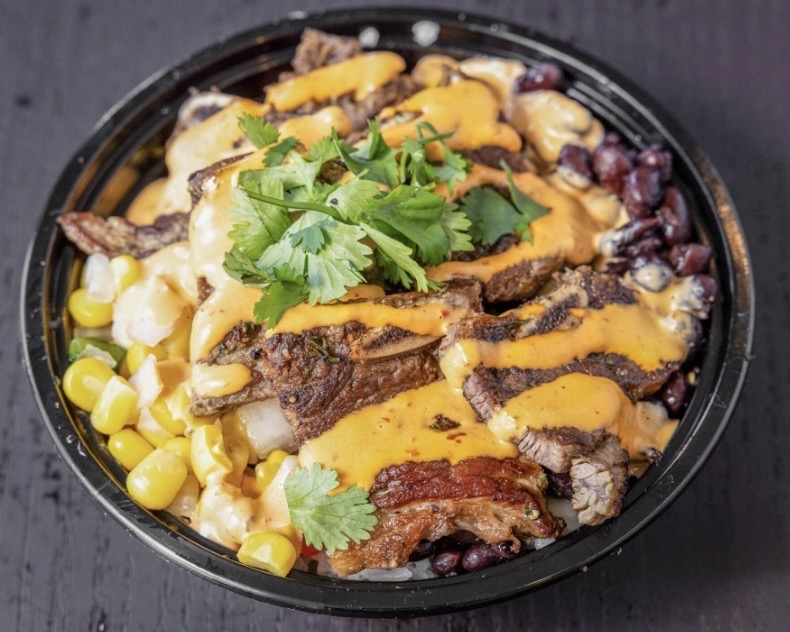 16oz Beef Short Rib Southwest Bowl includes: cilantro rice, corn pico de gallo (corn, onions,jalapeƱos, tomatoe) black beans, beef short ribs drizzled with spicy creamy chipotle sauce (sauce is given on the side) garnished with cilantro.
