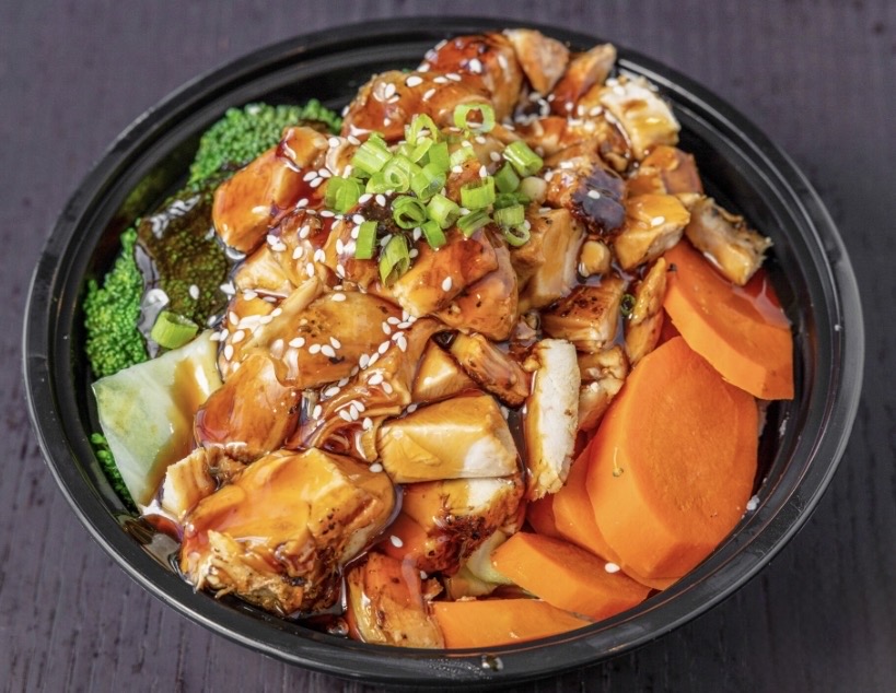 16oz- Chicken Thigh Teriyaki Bowl includes white steamed rice, vegetables (brocoli, cabbage, carrots) chicken thigh drizzled with teriyaki sauce and a side of spicy mayo (sauce will be given on the side) topped with sesame seeds and green onions.