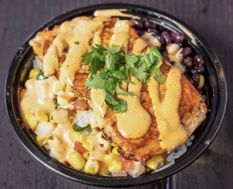 16oz Salmon Southwest Bowl includes: cilantro rice, corn pico de gallo (corn, onions, jalapeño,tomatoe) black beans a salmon fillet drizzled with a spicy creamy chipotle (sauce is given on the side) garnished with cilantro.