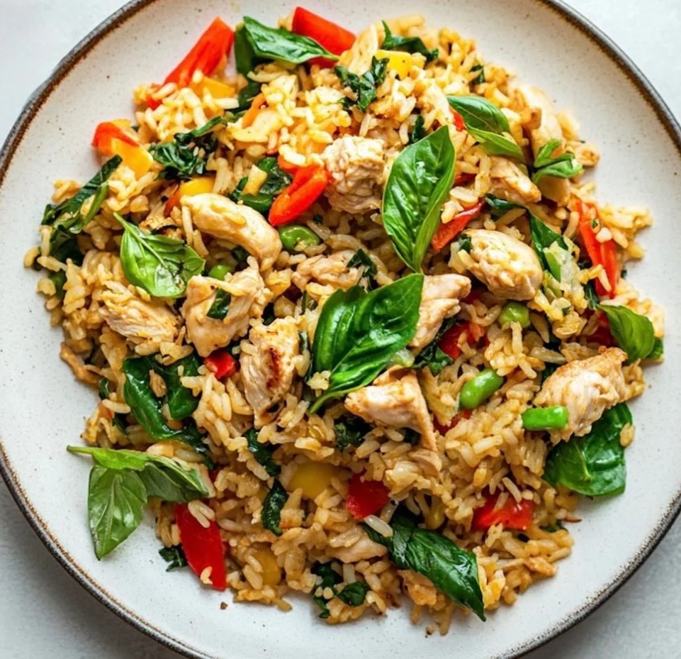 A take-out classic. Grilled marinated chicken, white rice pan-fried in ginger, garlic, cherry tomatoes, thai basil, egg and bell pepper. Seasoned with light tamari, seasme an scallion.