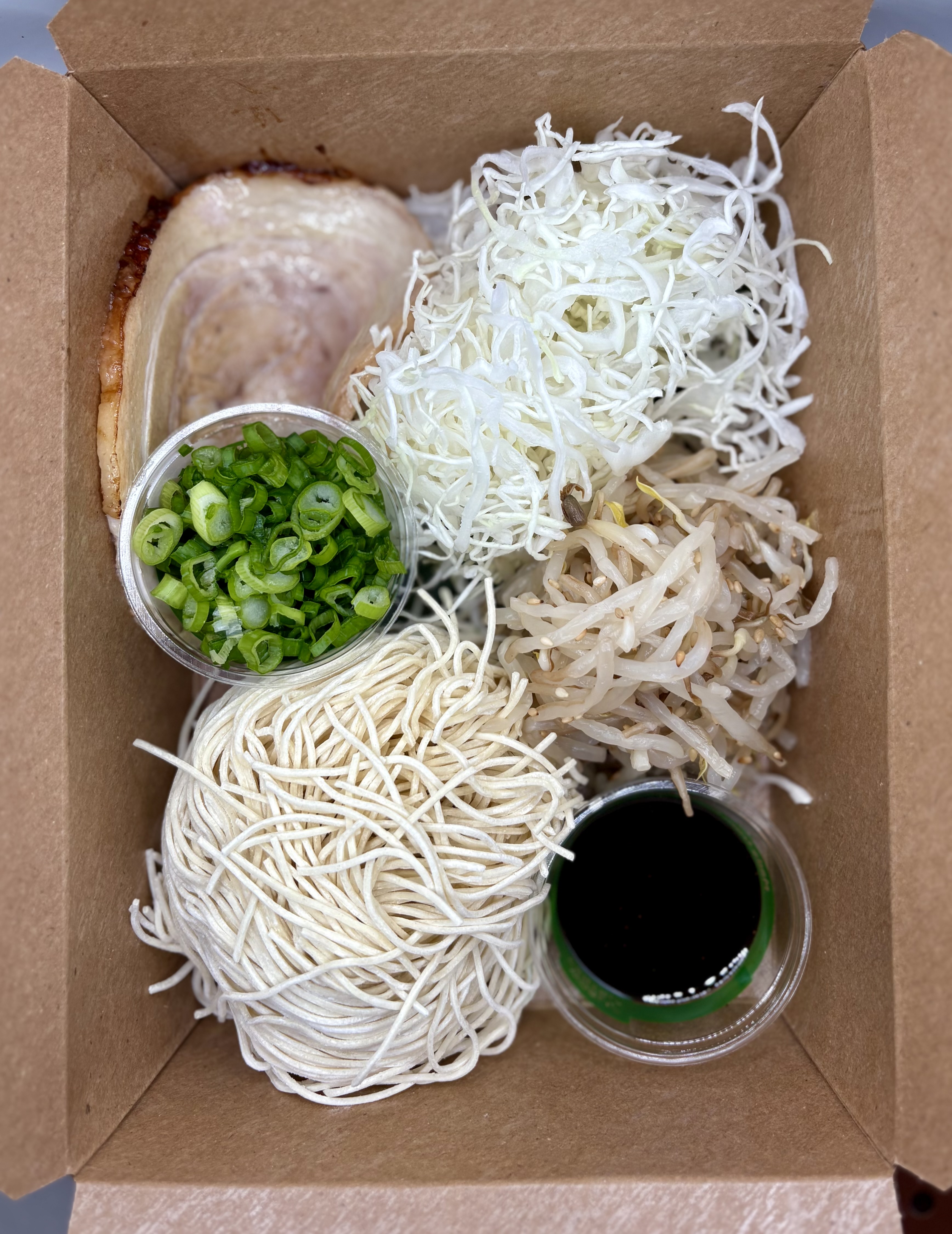 Momotaro Ramen comes with two containers. The first contains 12 oz of tonkotsu broth. The second contains 5 oz of the noodles and toppings: chashu pork belly, green cabbage, marinated bean sprouts, half a marinated egg, black garlic oil, and scallions.