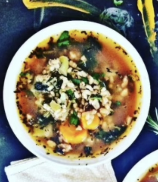Ingredients: shiitake mushrooms, kale, broccoli, carrot, celery, onion, barley, garlic, olive oil, pink salt