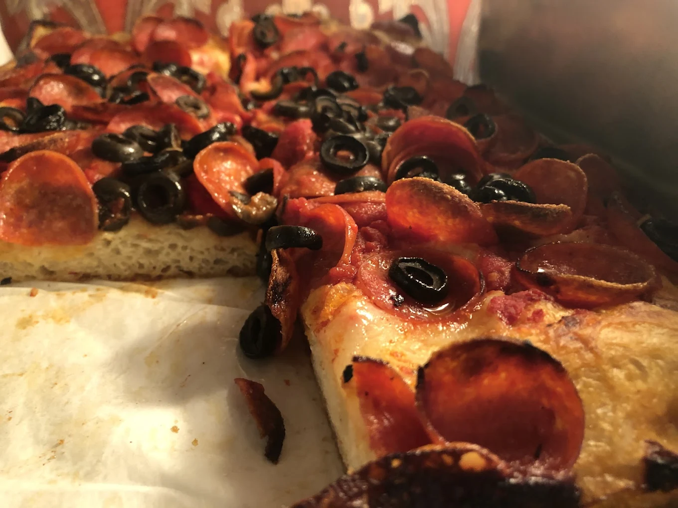 Topped with California made mozzarella, mild house made pizza sauce on top, on caramelized crust. Pepperoni and Olive toppings