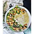 Red Lentil with Caramelized onion: organic red lentils, organic brown rice, lemon, organic mint, onion, organic coconut oil, olive oil, spices.