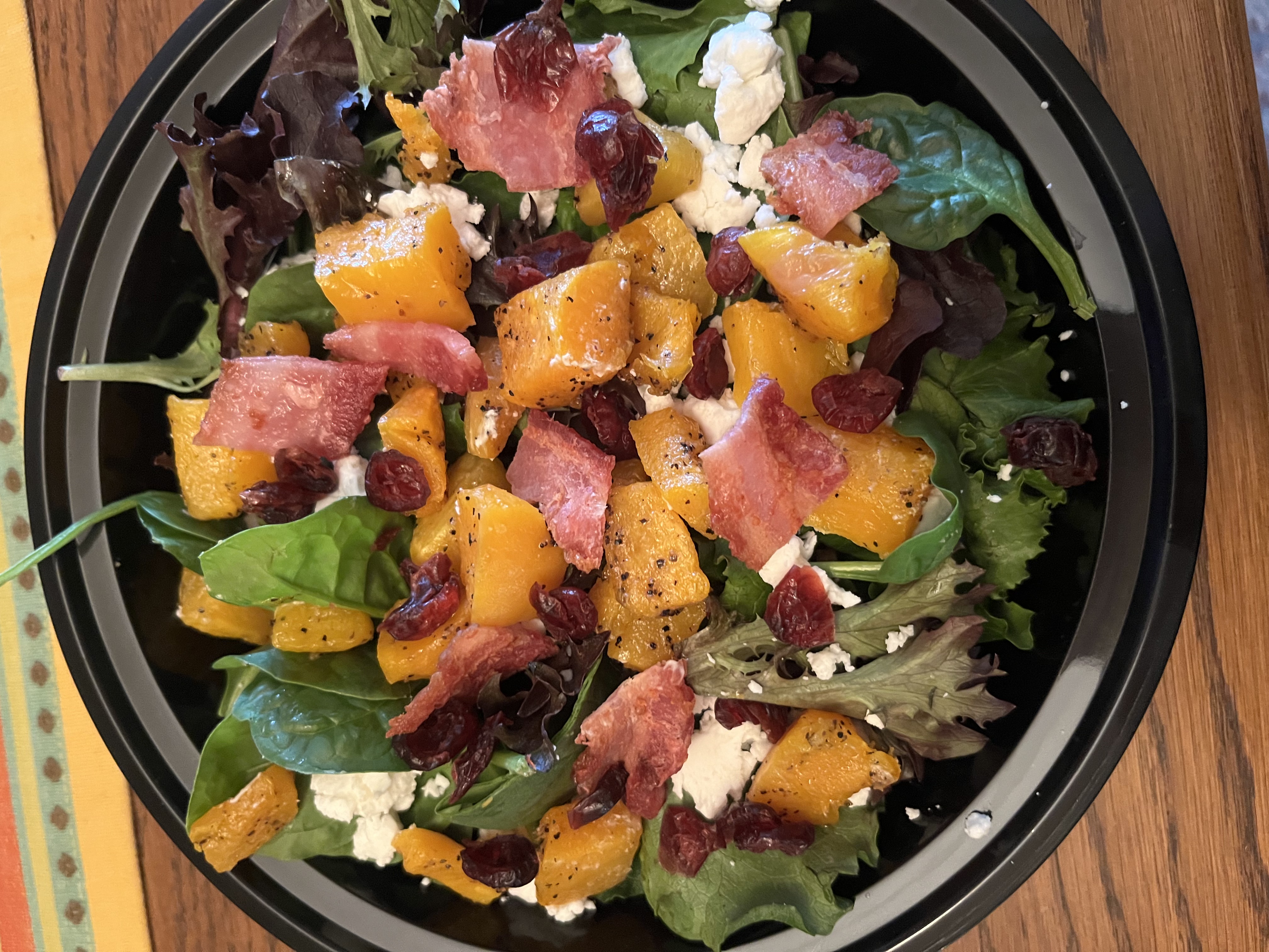 Ingredients: butternut squash, bacon, goat cheese, dried cranberries with maple balsamic dressing