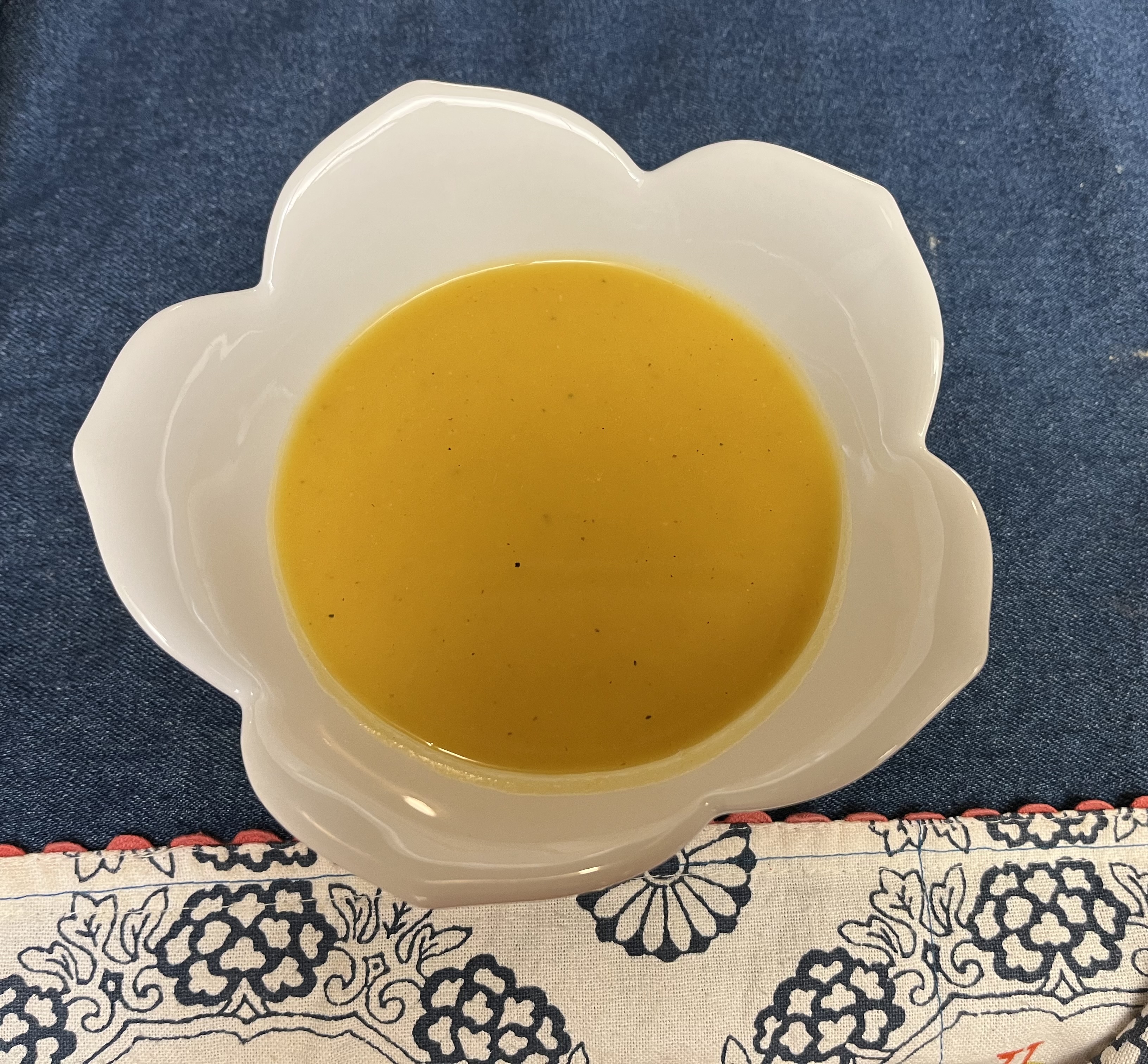 Ingredients: Shallots, fresh ginger, cardamom, cumin, butternut squash, green apples, freshly ground white pepper, fresh lemon, solar dried sea salt from Baja coast and a pinch of cayenne pepper.