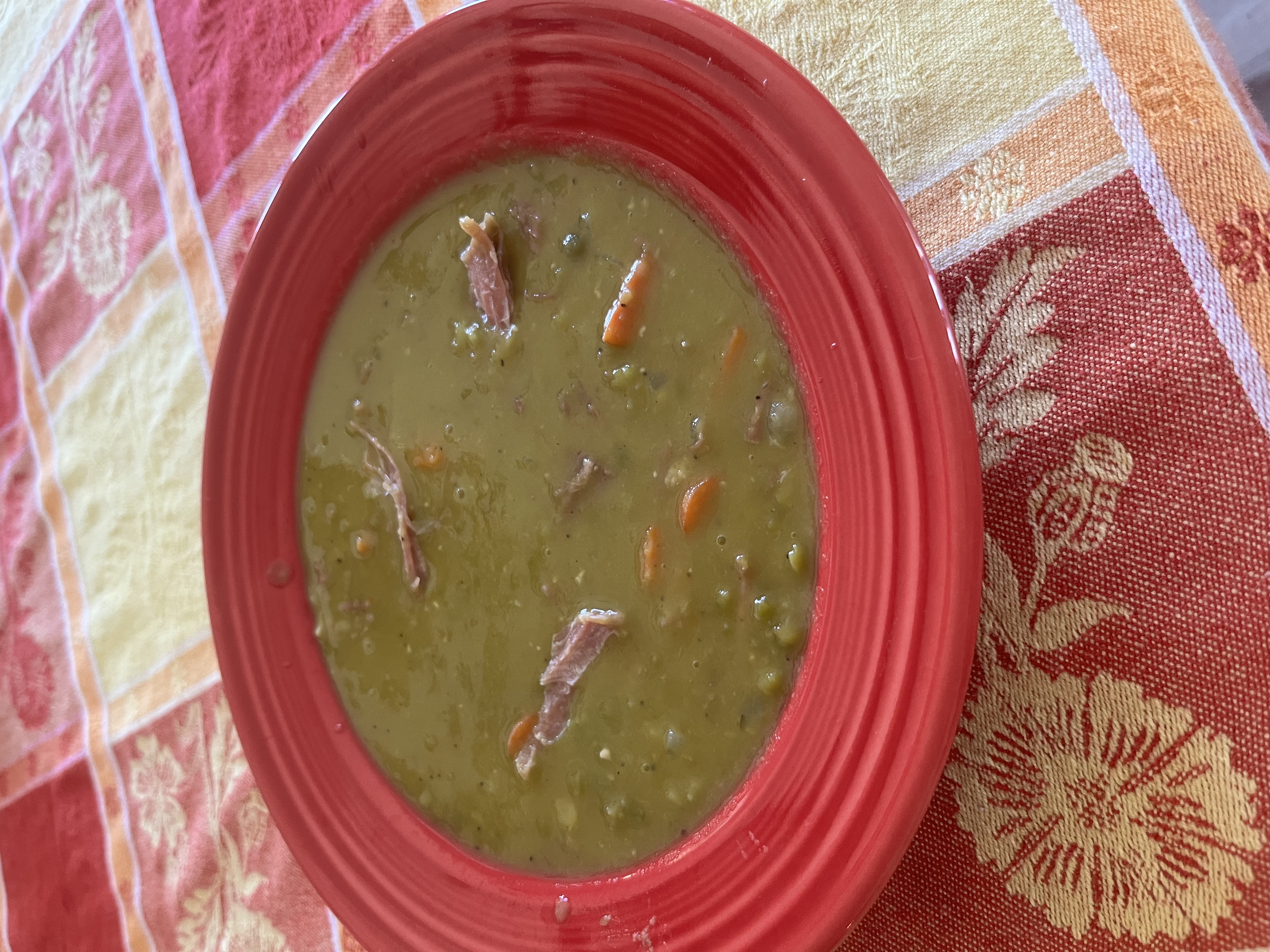 Ingredients: boiled with ham bone, peas, carrots, celery, onions, salt and pepper