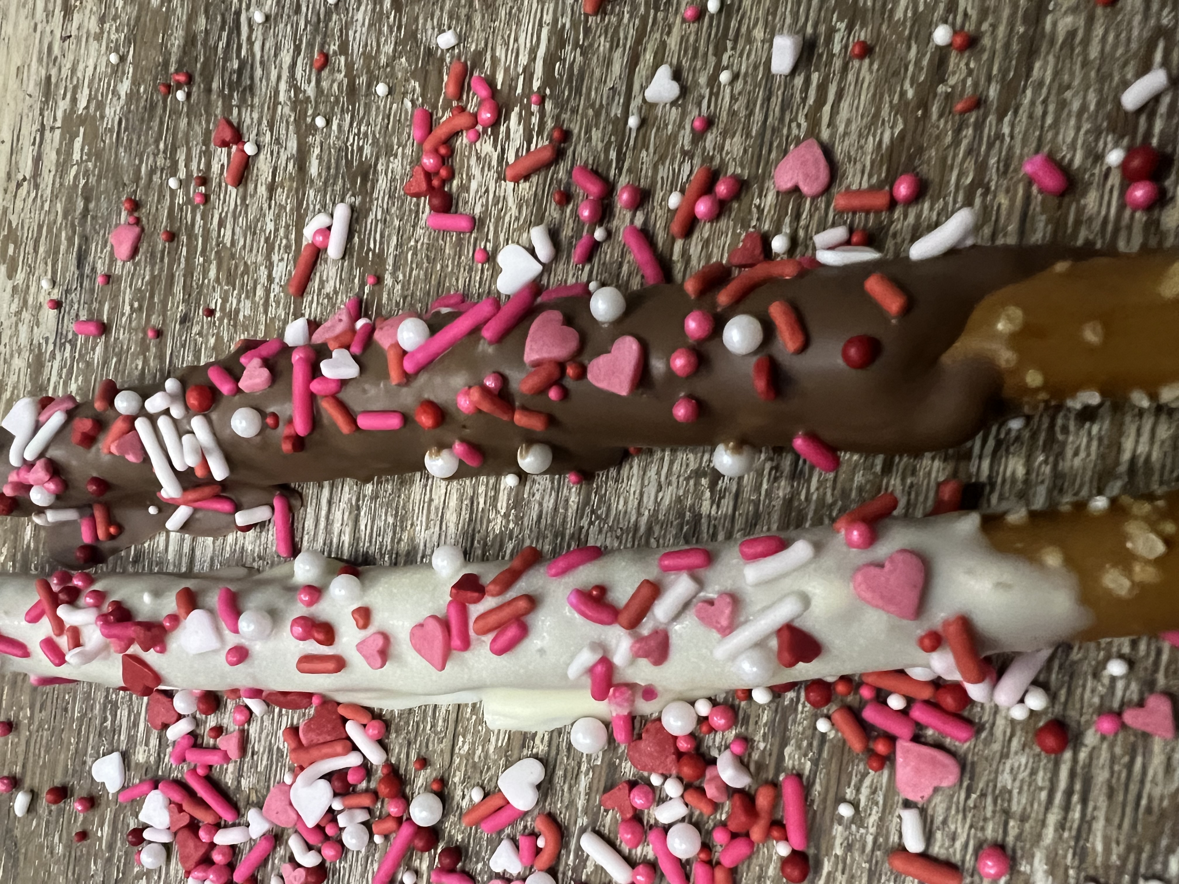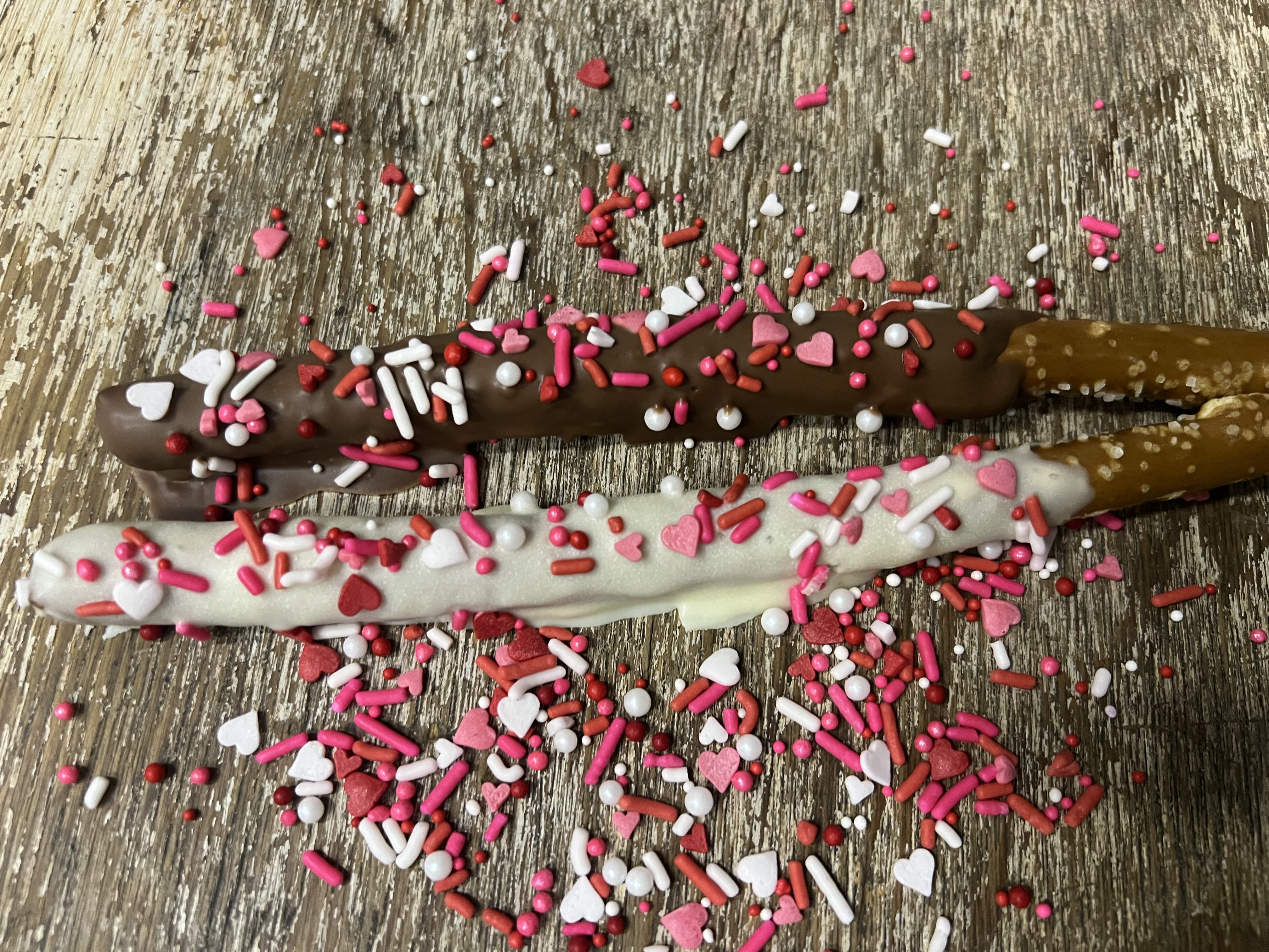 Get a 2 pack of jumbo chocolate covered pretzels. You get 1 white chocolate vanilla and 1 milk chocolate covered pretzels Sprinkled with Valentines sprinkles..