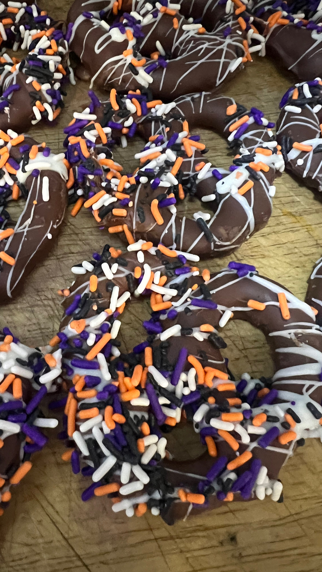 2 pack of jumbo chocolate covered pretzels. You get one white chocolate and one milk chocolate covered pretzels. They are decorated for Halloween.