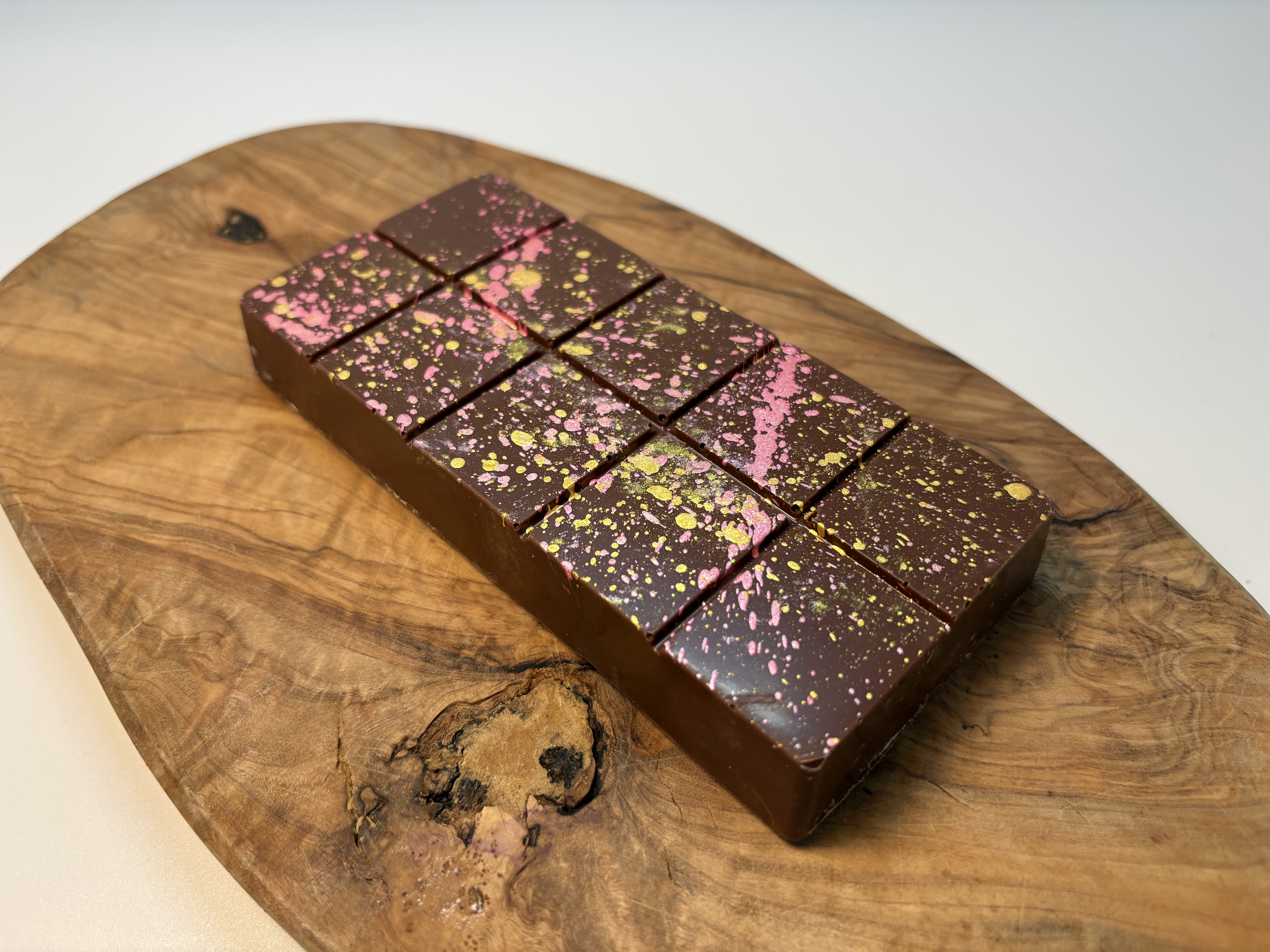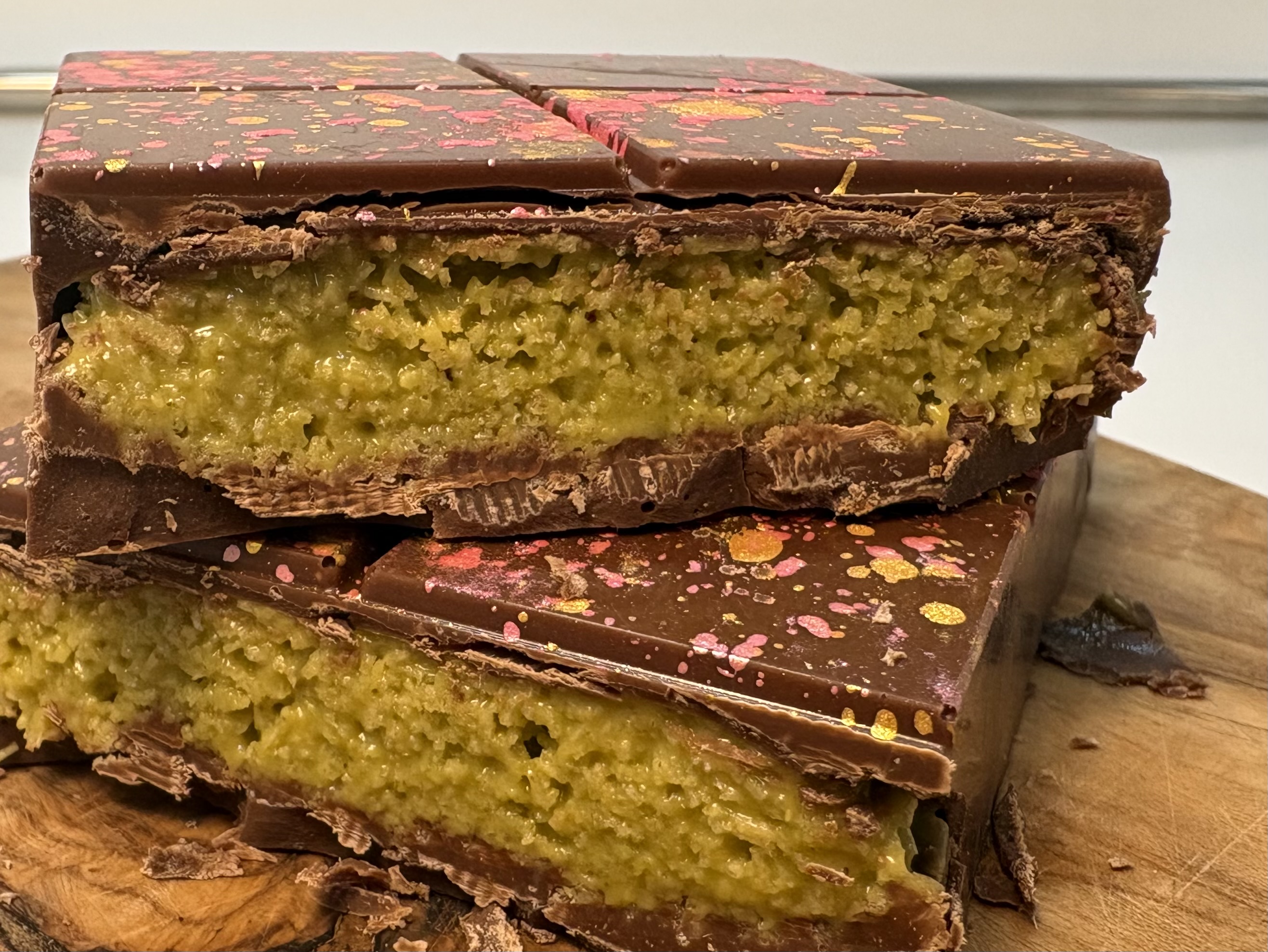 Creamy, crunchy, and undeniably luxurious. Rich, nutty notes from our homemade pistachio filling meet the perfect crunch of toasted kataifi to create a balanced bite with a smooth, lingering finish. Hand-crafted in small batches using high-quality Belgian milk chocolate, this 8.7oz bar is pure, luscious, and unforgettable.