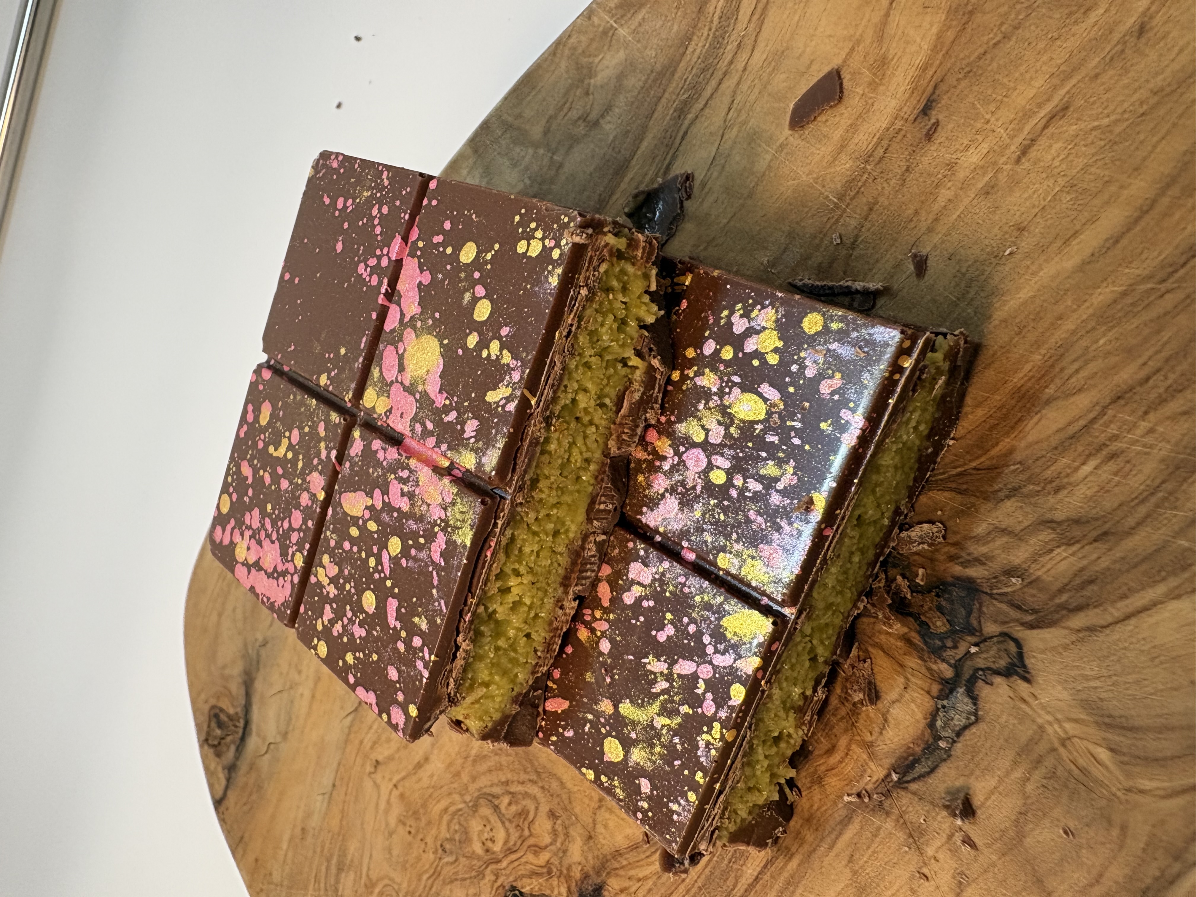 We believe the 'true' Dubai bar requires uncompromising ingredients. Our signature center is a luscious combination of rich pistachio, toasted crunchy Kataifi, and a subtle dash of tahini. To finish, we use high-grade Belgian chocolate—54% Dark and 33% Milk—to form the shell of our hand-scooped large bars and minis. Each piece is individually painted and wrapped by hand with meticulous care.